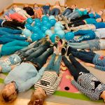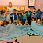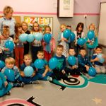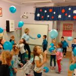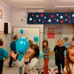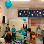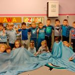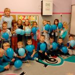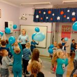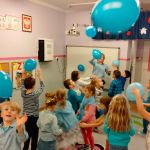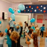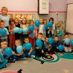 Dzieci z gr. IV – obchodziły w listopadzie Międzynarodowy Dzień Praw Dziecka. Zgodnie z wytycznymi UNICEFU, który przypomina co roku o wykorzystaniu koloru niebieskiego jako symbolu solidarności ze wszystkimi dziećmi na świecie, również z tymi , których prawa nie są przestrzegane, dzieci razem ze mną ubrały się na niebiesko. Były też niebieskie balony i niebieskie słoneczko z naszych ciał .