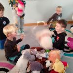 W tym dniu dzieci miały moc atrakcji: poznały historię powstania pluszowej zabawki, wykonały różne zadania związane z misiem z wykorzystaniem tablicy interaktywnej, pobawiły się w zabawę z misiem przy muzyce, wykonały różnorodne karty pracy związane tematycznie i obchodziły urodziny misia śpiewając mu piosenki urodzinowe w dwóch językach: polskim i angielskim, a na koniec otrzymały okolicznościowe medale i poczęstowały się „Misiami-Lubisiami”. Następnego dnia wykonały grupowo prace plastyczne z zasuszonych liści, zebranych na spacerach, pt. ” Miś i Misiowa”.