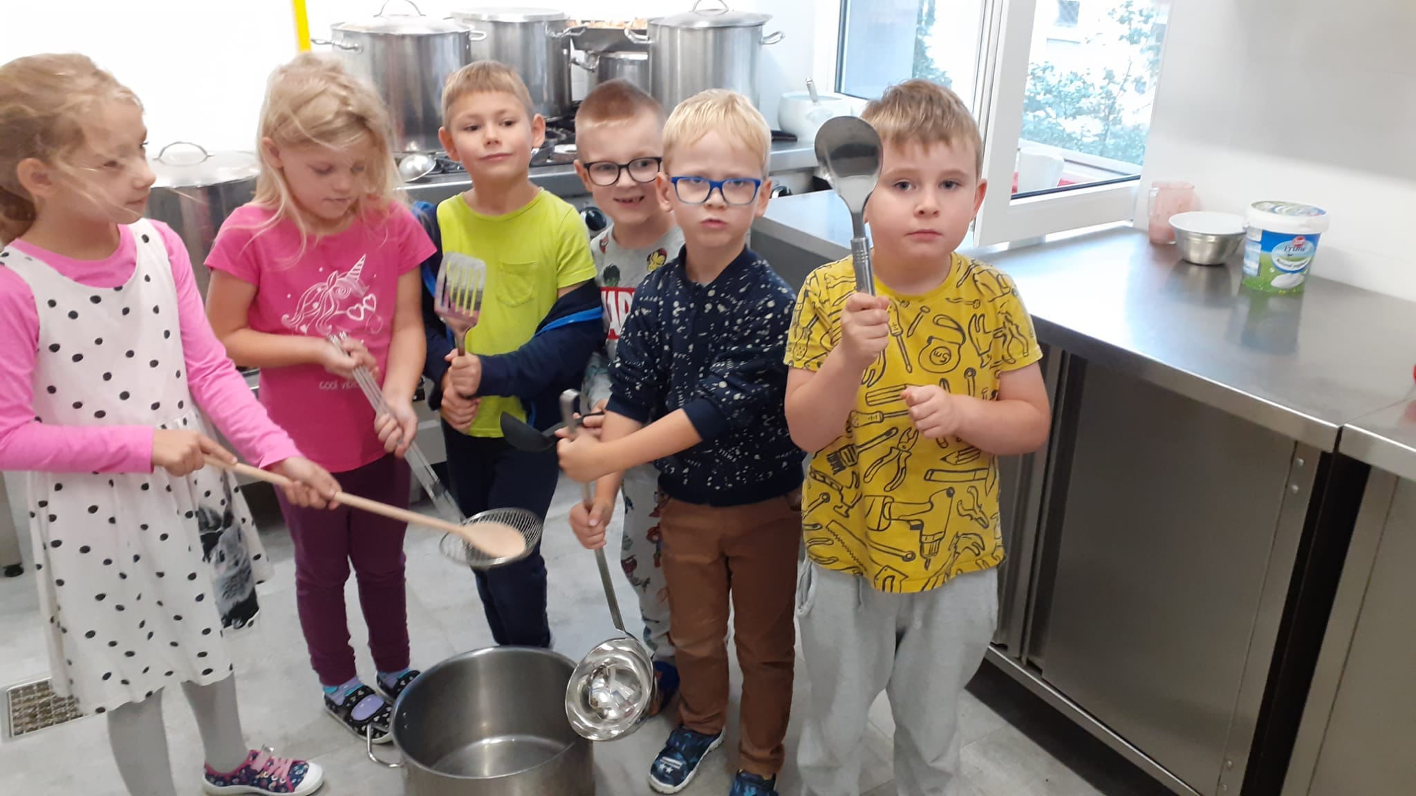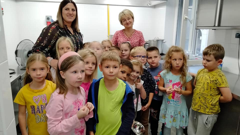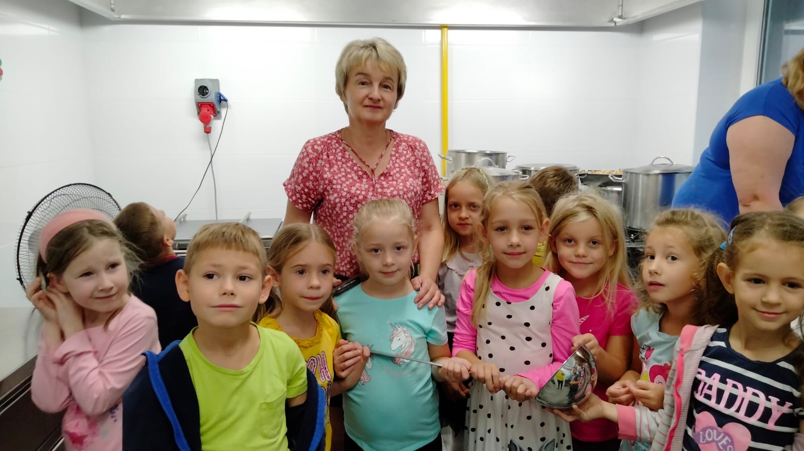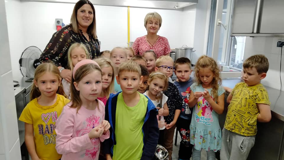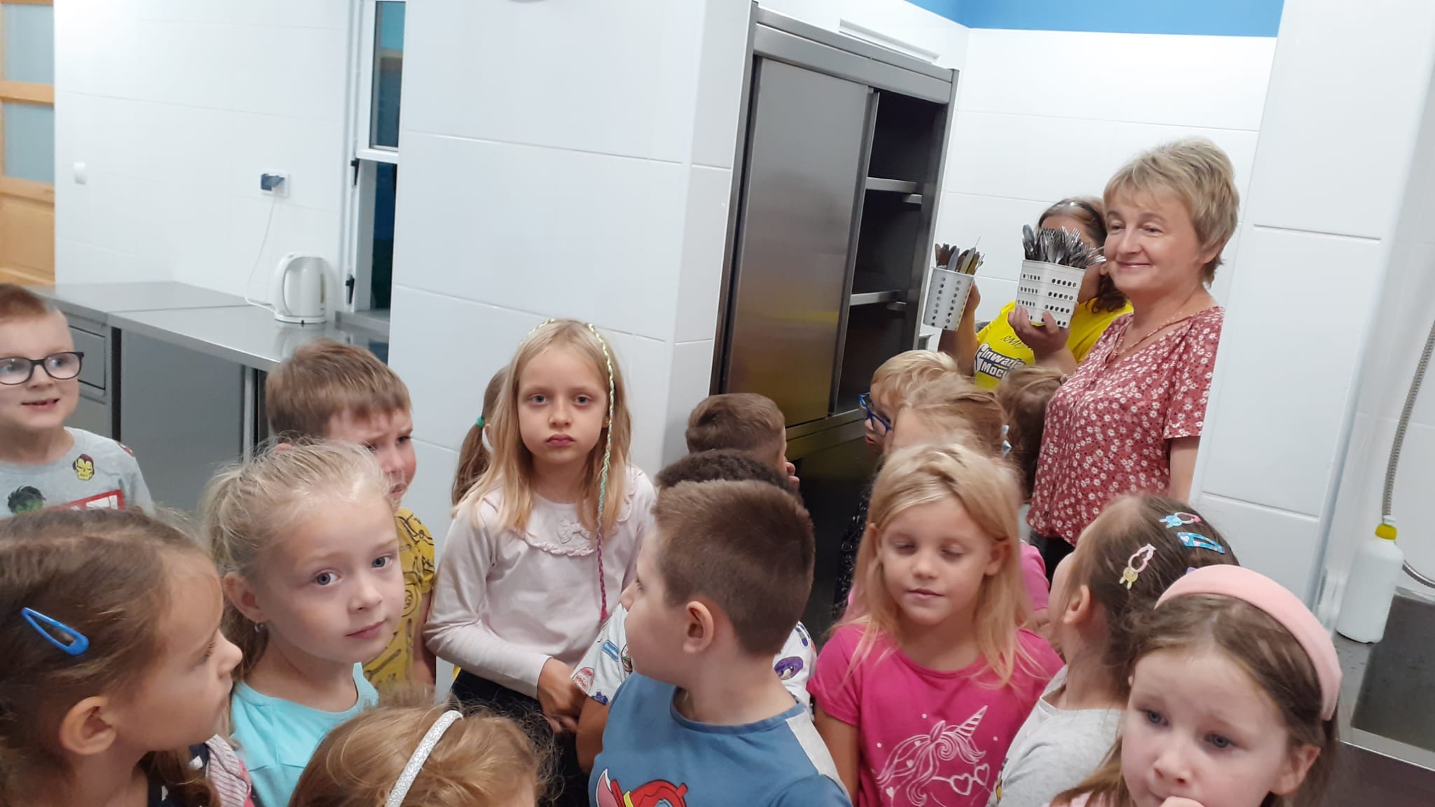 , czyli dzieci z grupy IV, w ramach preorientacji zawodowej zwiedziły kuchnię przedszkolną i miały możliwość porozmawiania z paniami kucharkami: Panią Renią i Panią Iwonką na temat ich pracy. Dzieci poznały sprzęty i naczynia kuchenne, które wydały im się ogromne. Spróbowały również podać paniom kucharkom przepis na zupę. Niektóre doskonale wiedziały jakie warzywa należy do niej wrzucić. Jednym słowem wizyta była „owocna”.![]()