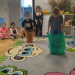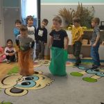 Przedszkolaki zmierzyły się w zawodach sportowych skok w workach , skoki przez gumę , oraz rozszyfrowali przepis na pyszne gofry 🧑‍🍳👨‍🍳👩‍🍳
