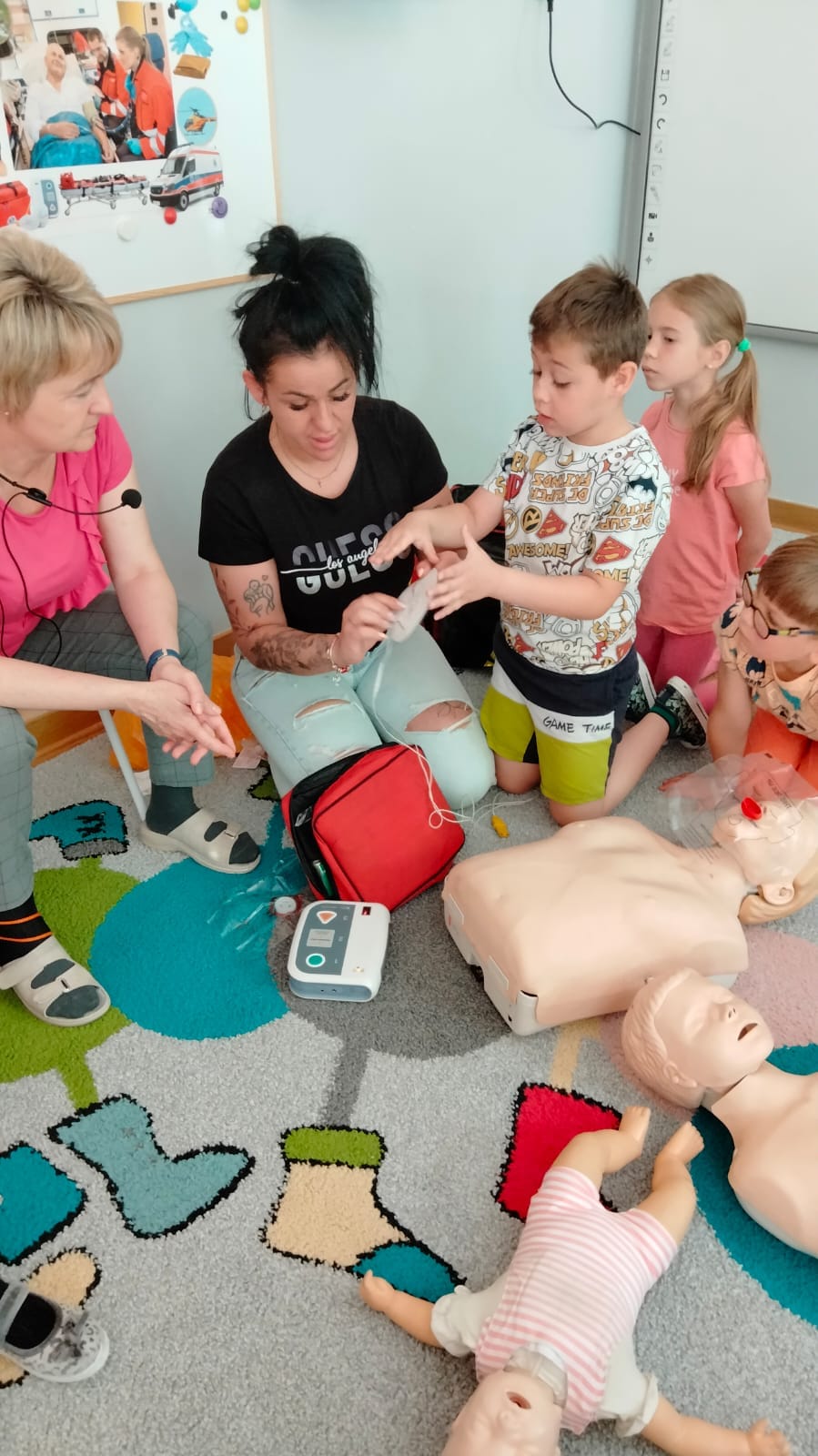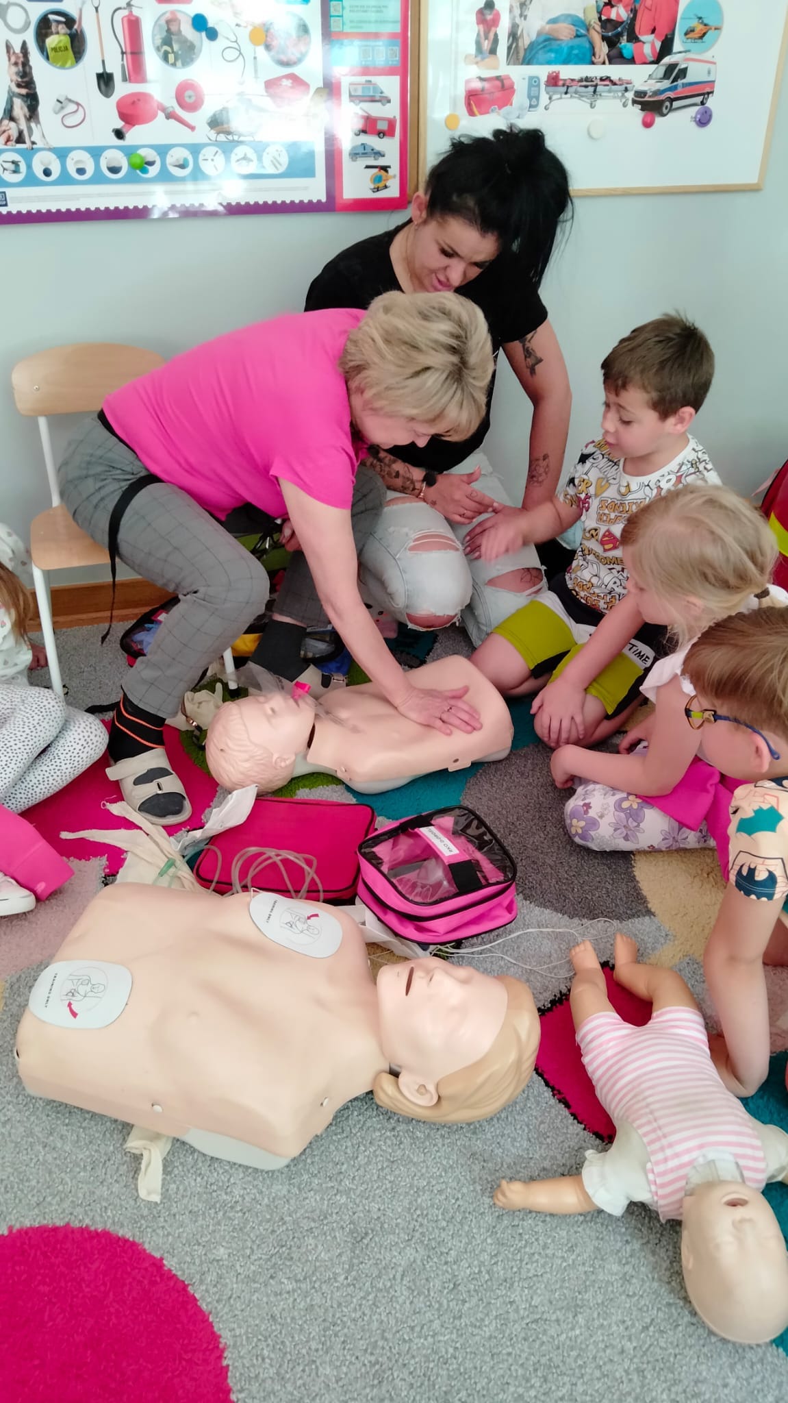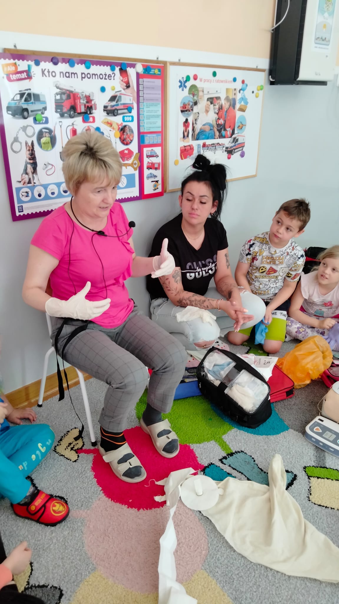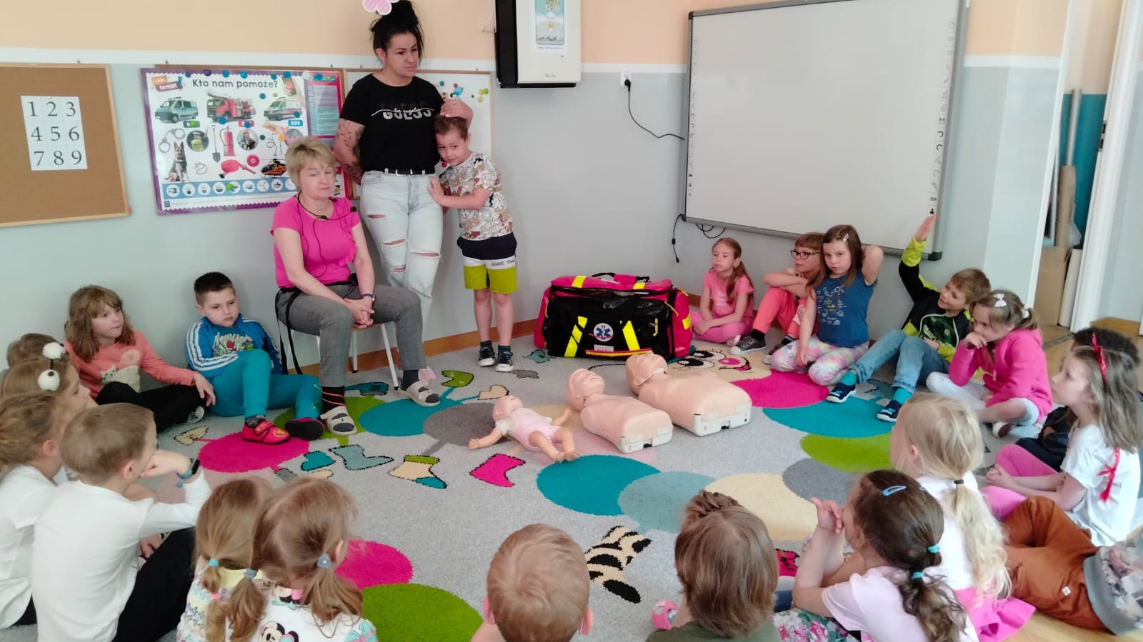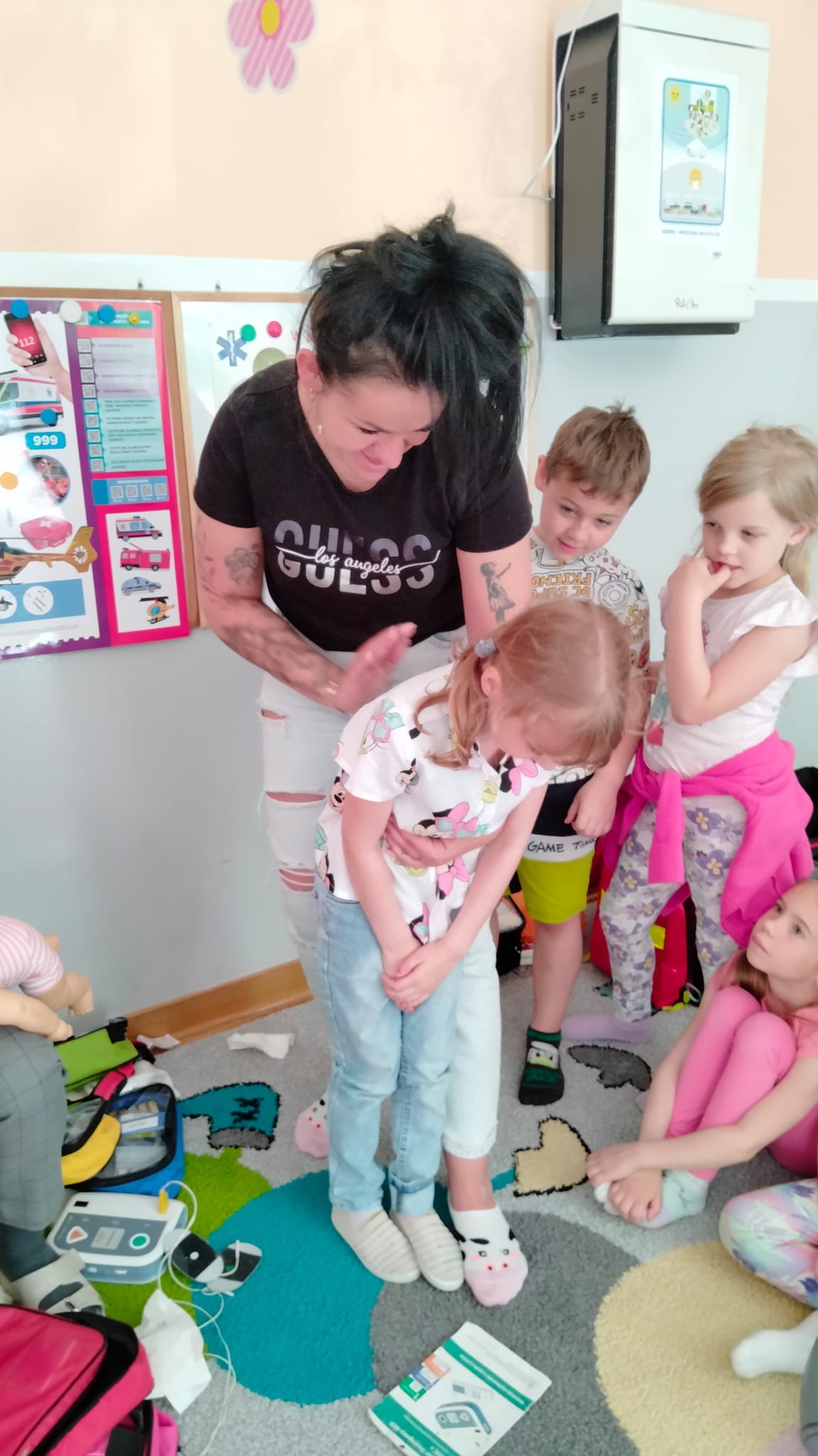 gościły ostatnio Mamę Michałka, która zapoznała ich z pracą ratownika medycznego. Dzieci zobaczyły jak wygląda resuscytacja krążeniowo oddechowa,obejrzały zawartość apteczki, defibrylator i inne sprzęty ratownika, które są na wyposażeniu karetki pogotowia. Dzięki przyniesionym fantomom dziecka i dorosłego dzieci próbowały „reanimować ” nieprzytomnego człowieka oraz wysłuchiwały bicie serca przez stetoskop. Przedszkolaki utrwaliły numery alarmowe i dowiedziały się jak należy się zachować w razie wypadku czy niebezpiecznej sytuacji