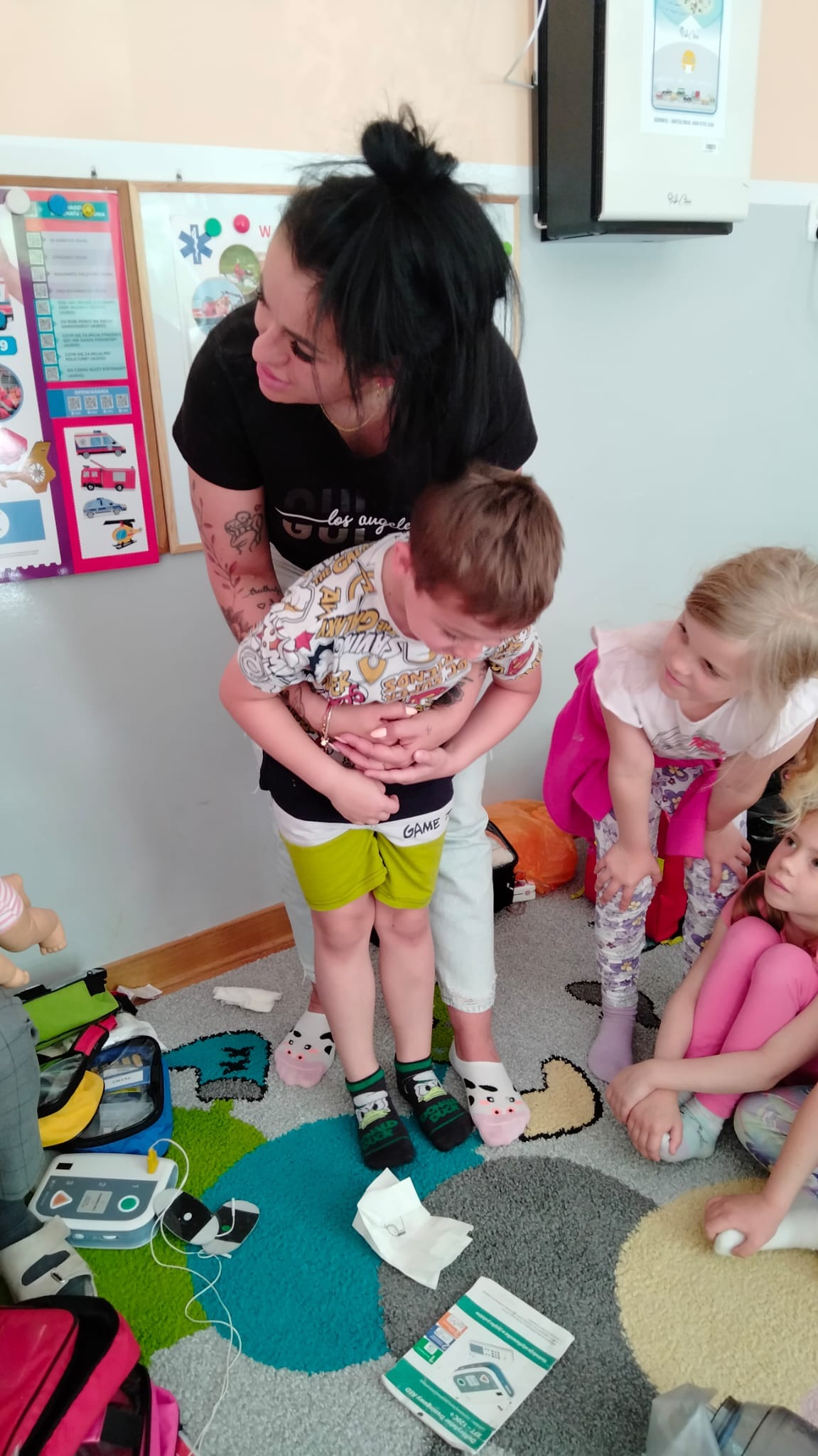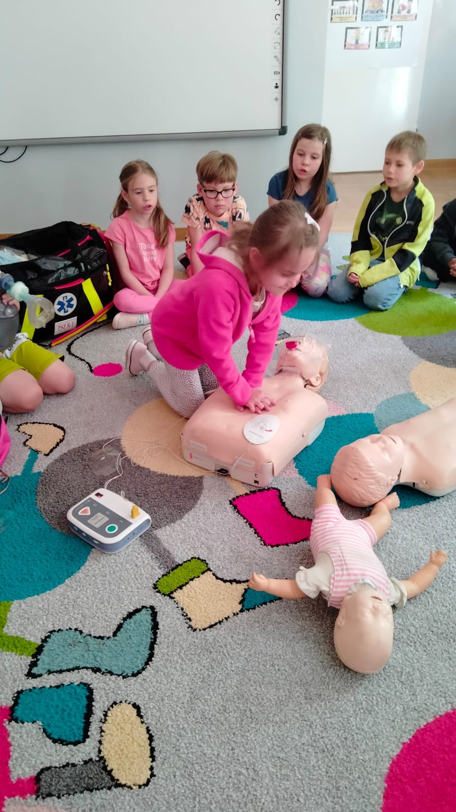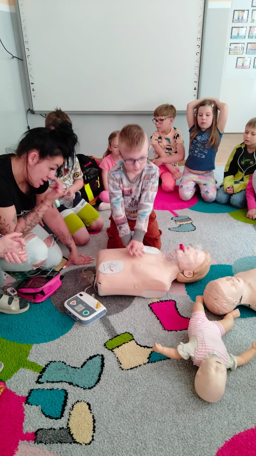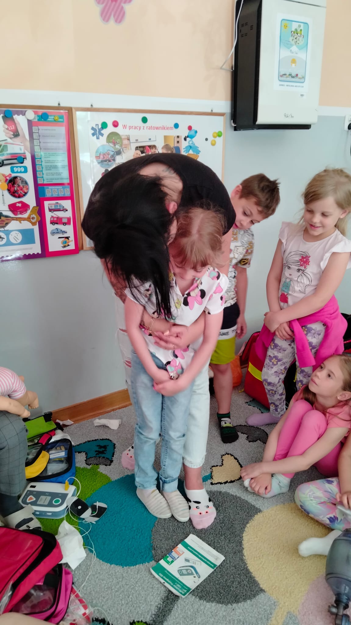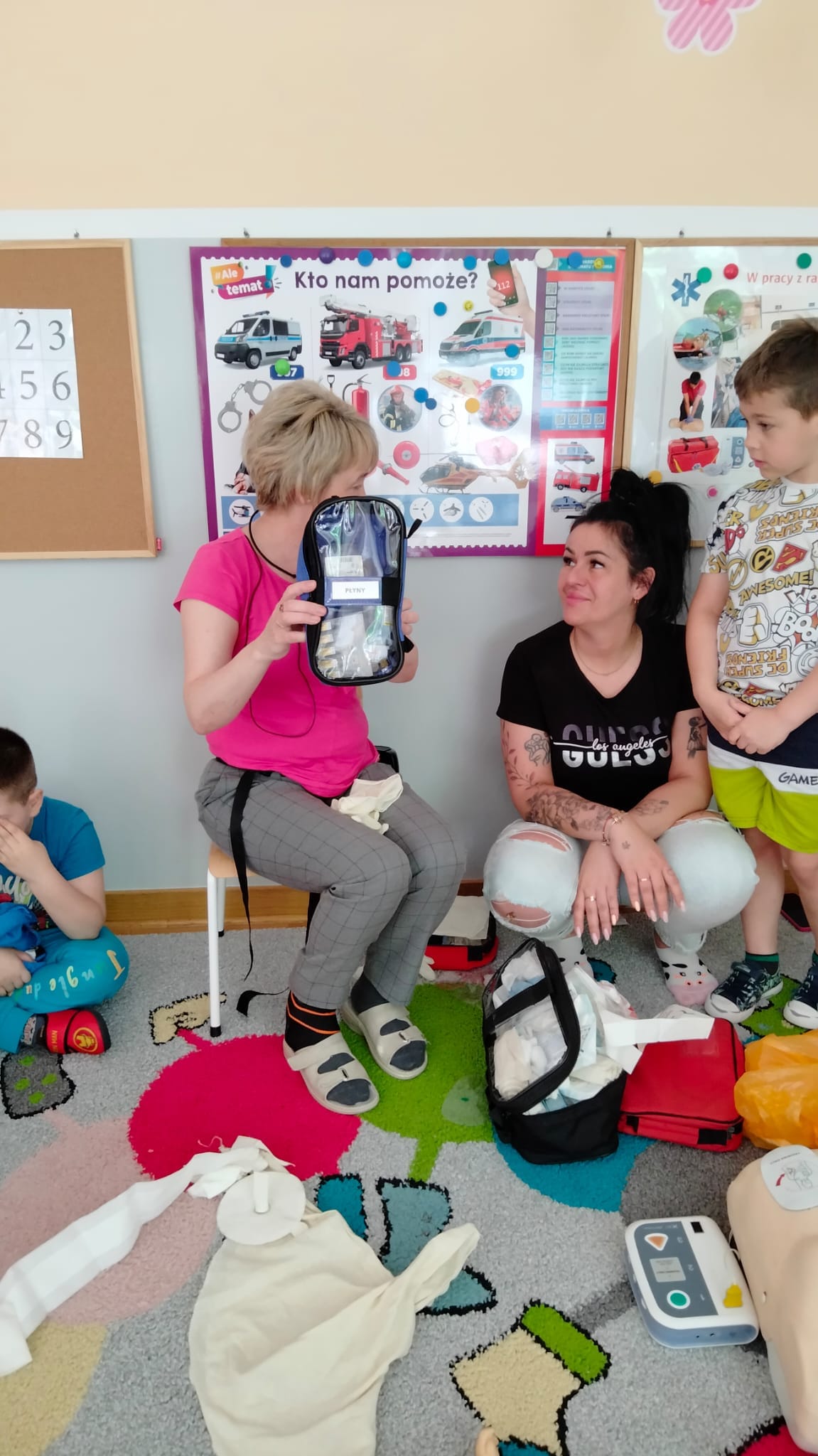 gościły ostatnio Mamę Michałka, która zapoznała ich z pracą ratownika medycznego. Dzieci zobaczyły jak wygląda resuscytacja krążeniowo oddechowa,obejrzały zawartość apteczki, defibrylator i inne sprzęty ratownika, które są na wyposażeniu karetki pogotowia. Dzięki przyniesionym fantomom dziecka i dorosłego dzieci próbowały „reanimować ” nieprzytomnego człowieka oraz wysłuchiwały bicie serca przez stetoskop. Przedszkolaki utrwaliły numery alarmowe i dowiedziały się jak należy się zachować w razie wypadku czy niebezpiecznej sytuacji