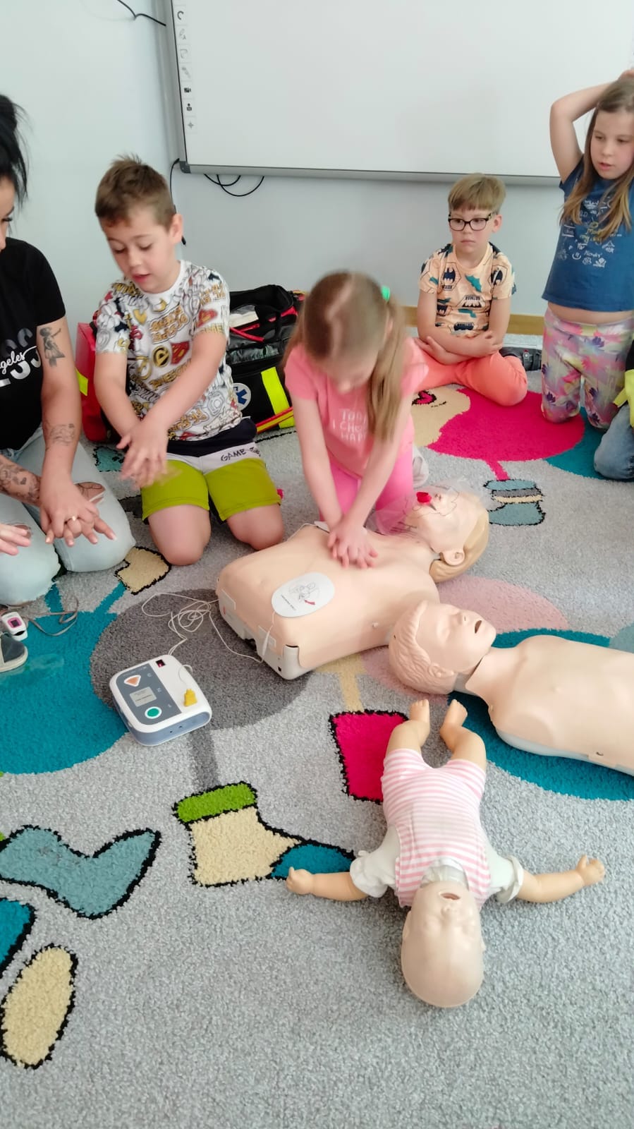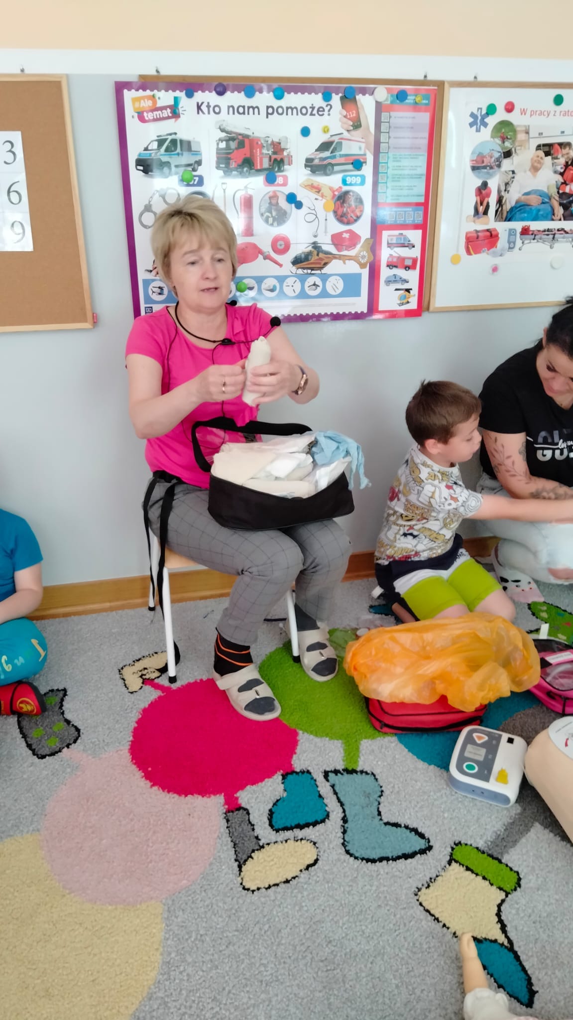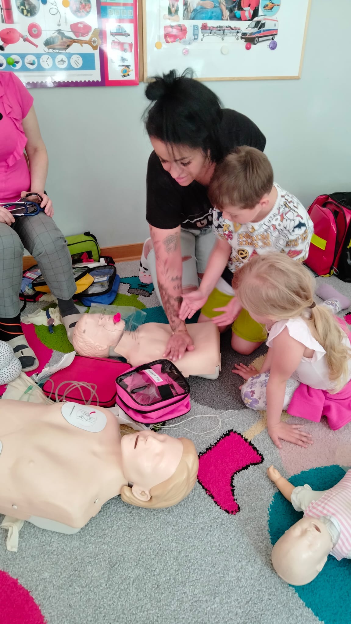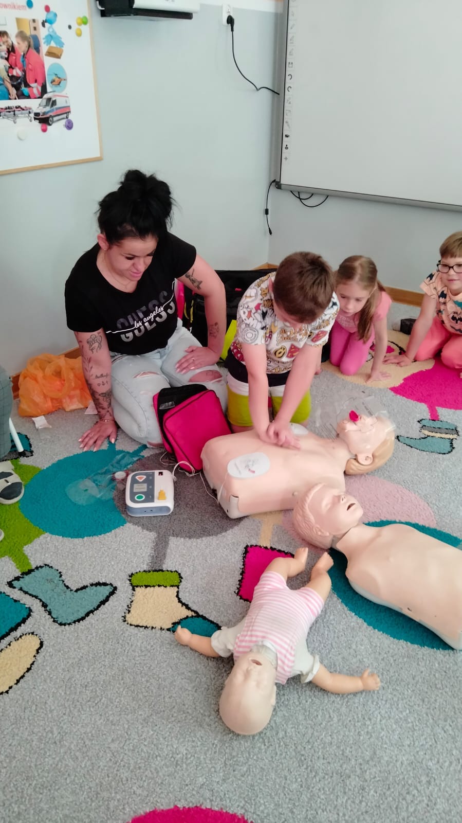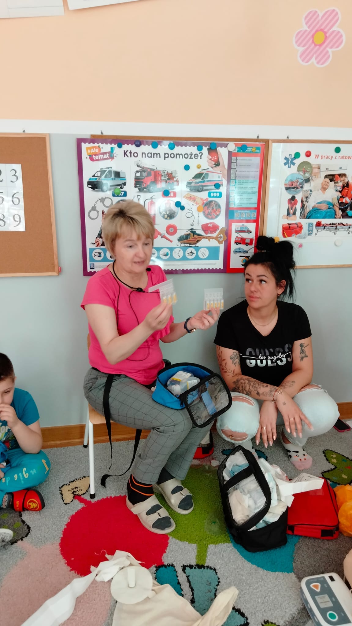 gościły ostatnio Mamę Michałka, która zapoznała ich z pracą ratownika medycznego. Dzieci zobaczyły jak wygląda resuscytacja krążeniowo oddechowa,obejrzały zawartość apteczki, defibrylator i inne sprzęty ratownika, które są na wyposażeniu karetki pogotowia. Dzięki przyniesionym fantomom dziecka i dorosłego dzieci próbowały „reanimować ” nieprzytomnego człowieka oraz wysłuchiwały bicie serca przez stetoskop. Przedszkolaki utrwaliły numery alarmowe i dowiedziały się jak należy się zachować w razie wypadku czy niebezpiecznej sytuacji