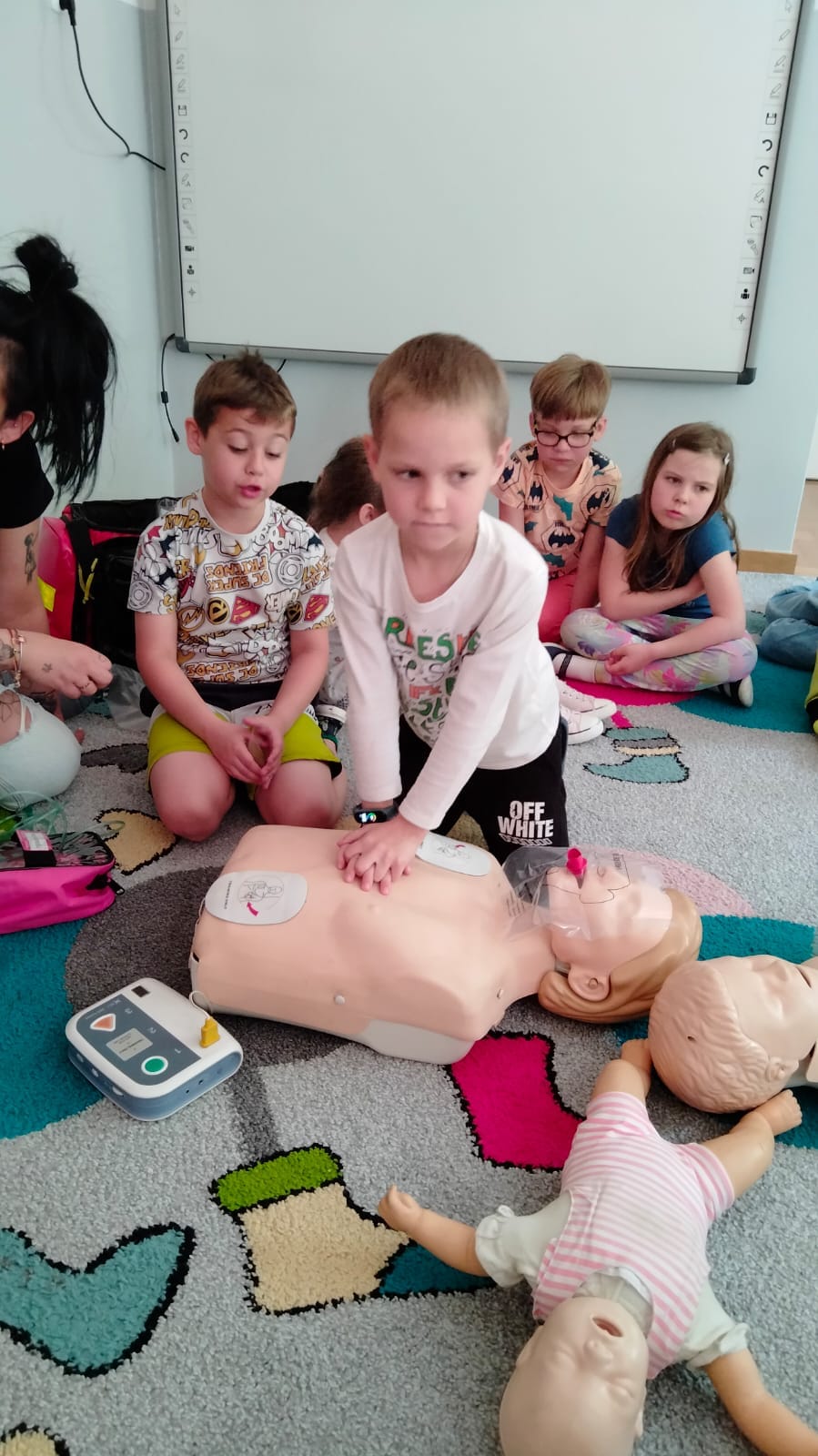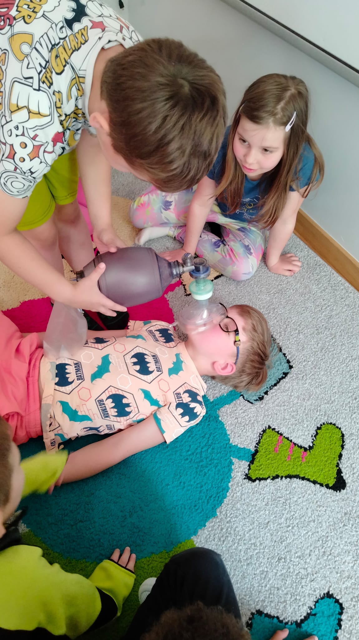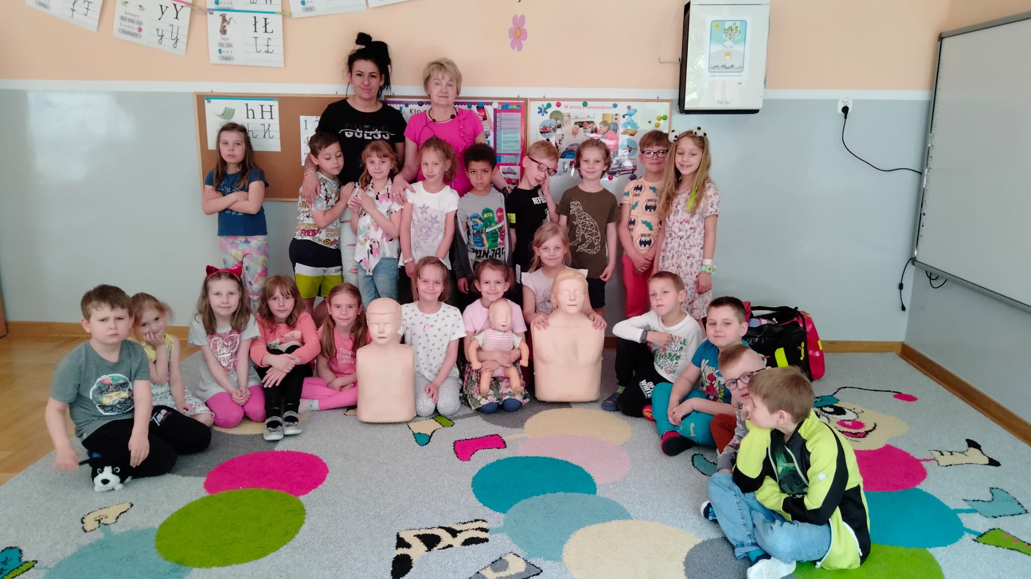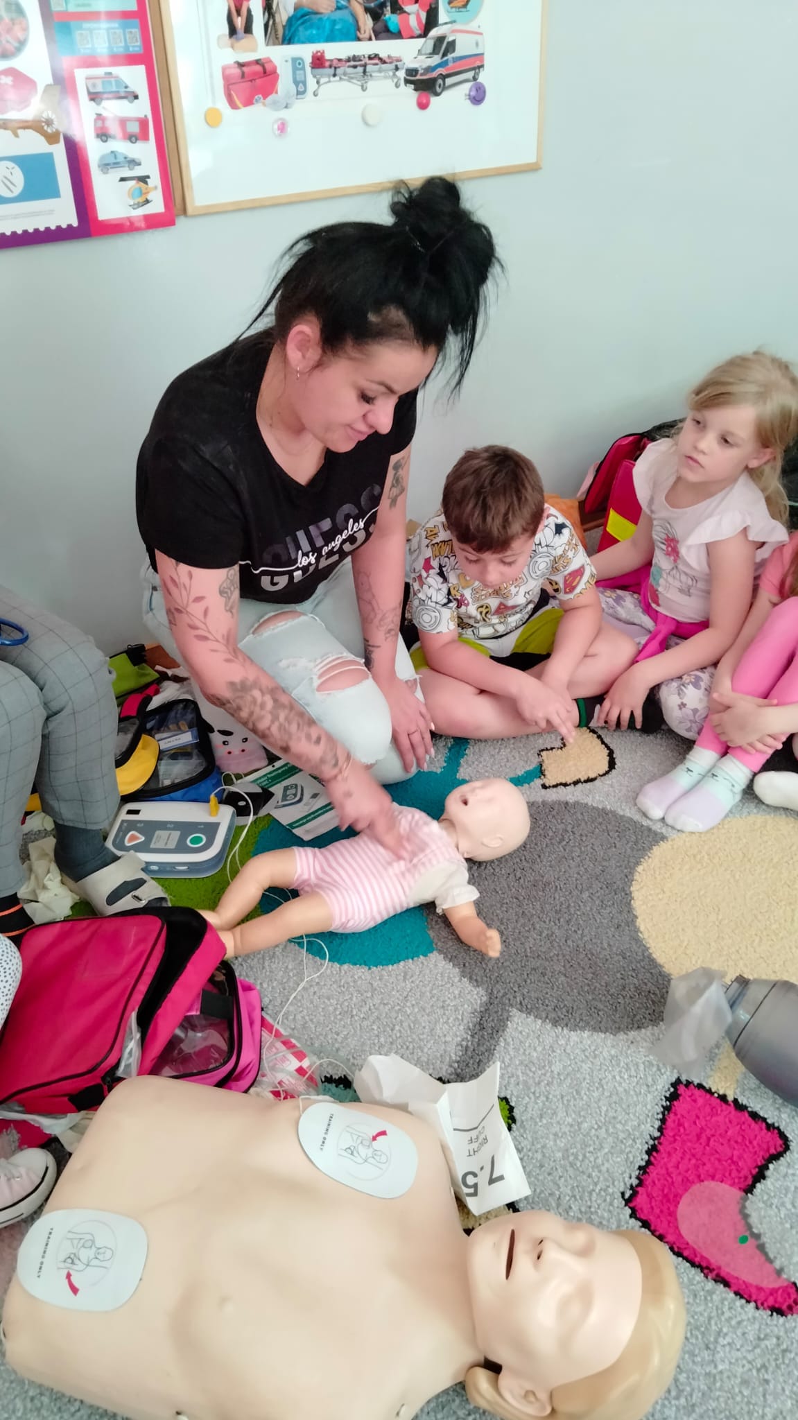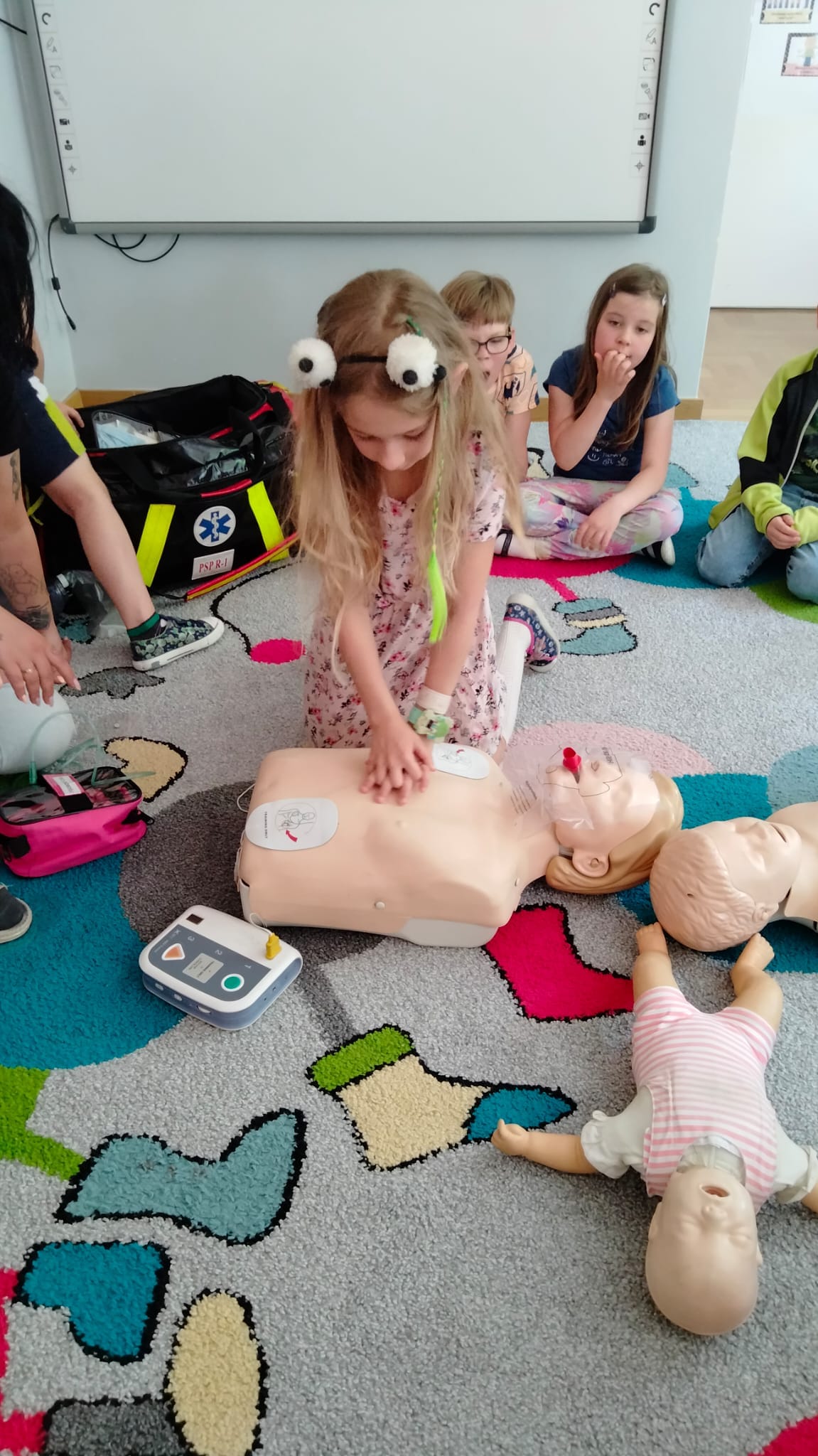 gościły ostatnio Mamę Michałka, która zapoznała ich z pracą ratownika medycznego. Dzieci zobaczyły jak wygląda resuscytacja krążeniowo oddechowa,obejrzały zawartość apteczki, defibrylator i inne sprzęty ratownika, które są na wyposażeniu karetki pogotowia. Dzięki przyniesionym fantomom dziecka i dorosłego dzieci próbowały „reanimować ” nieprzytomnego człowieka oraz wysłuchiwały bicie serca przez stetoskop. Przedszkolaki utrwaliły numery alarmowe i dowiedziały się jak należy się zachować w razie wypadku czy niebezpiecznej sytuacji