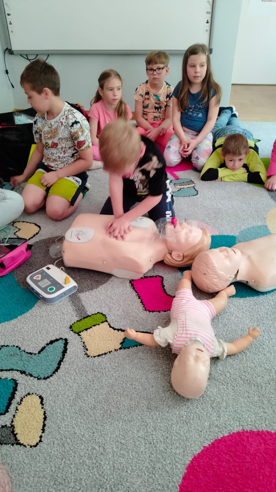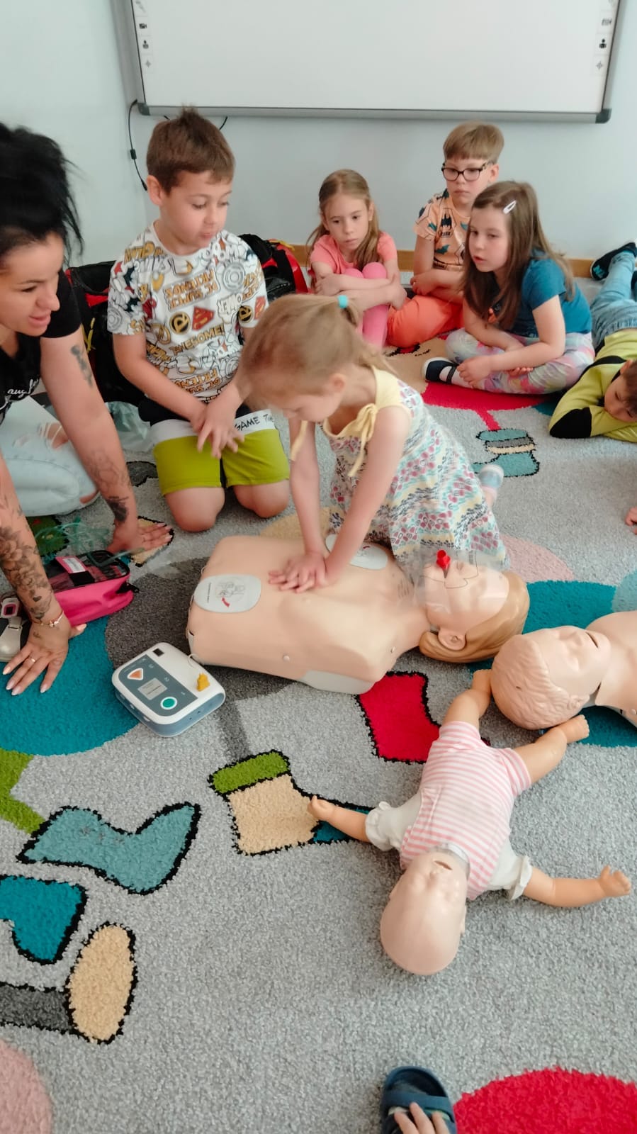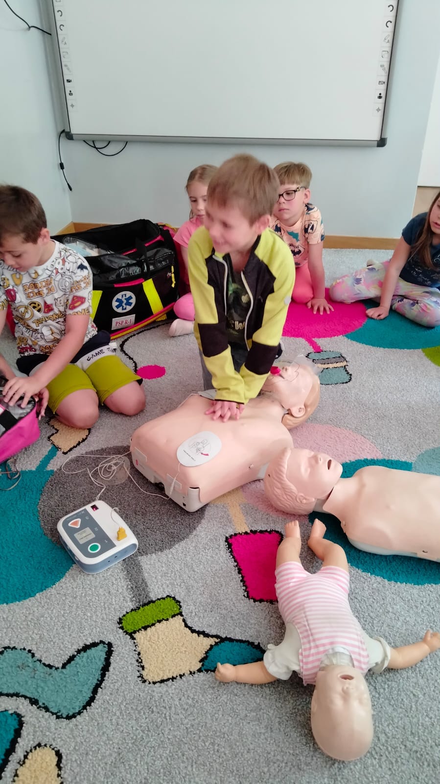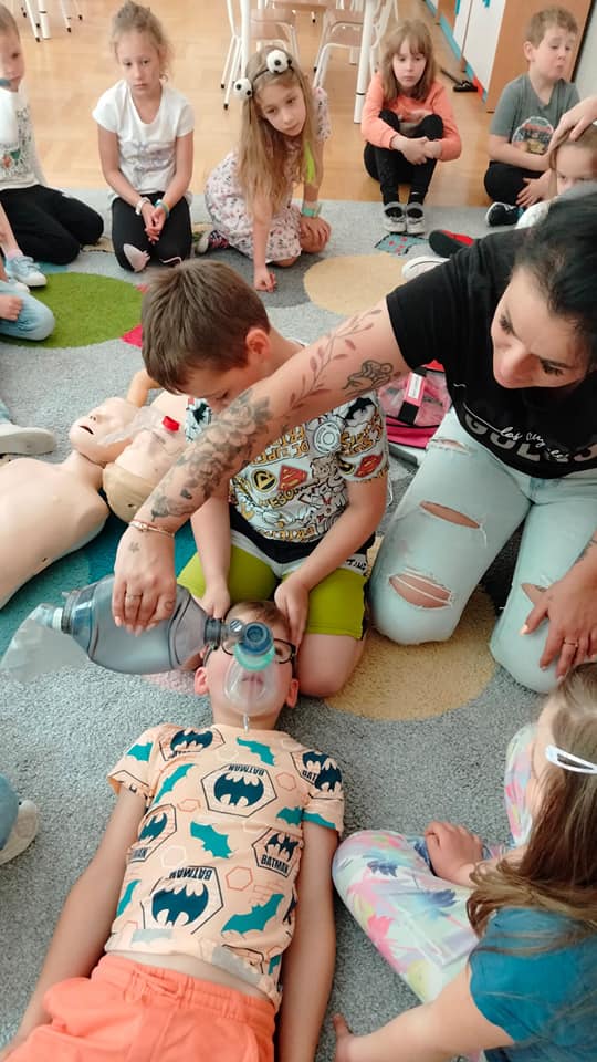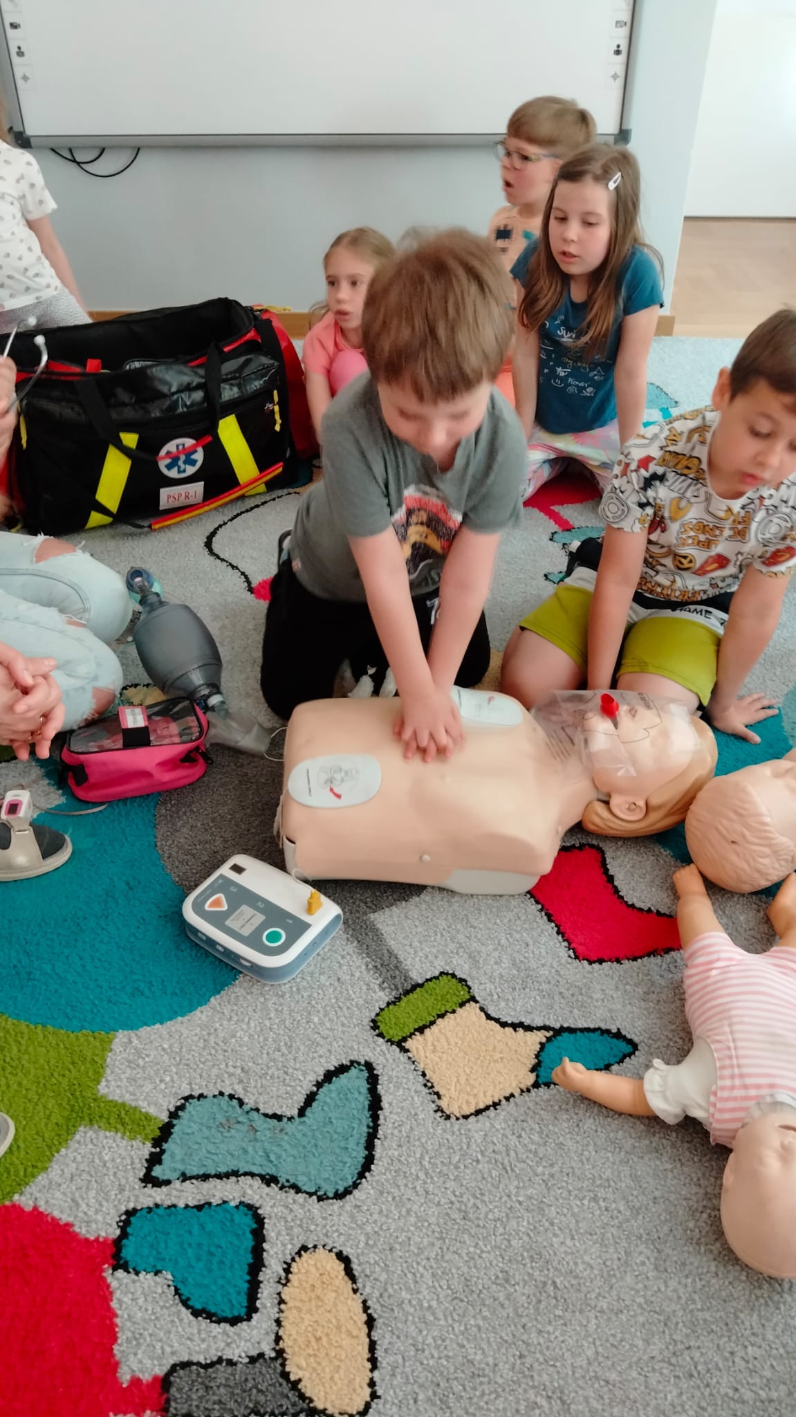 gościły ostatnio Mamę Michałka, która zapoznała ich z pracą ratownika medycznego. Dzieci zobaczyły jak wygląda resuscytacja krążeniowo oddechowa,obejrzały zawartość apteczki, defibrylator i inne sprzęty ratownika, które są na wyposażeniu karetki pogotowia. Dzięki przyniesionym fantomom dziecka i dorosłego dzieci próbowały „reanimować ” nieprzytomnego człowieka oraz wysłuchiwały bicie serca przez stetoskop. Przedszkolaki utrwaliły numery alarmowe i dowiedziały się jak należy się zachować w razie wypadku czy niebezpiecznej sytuacji