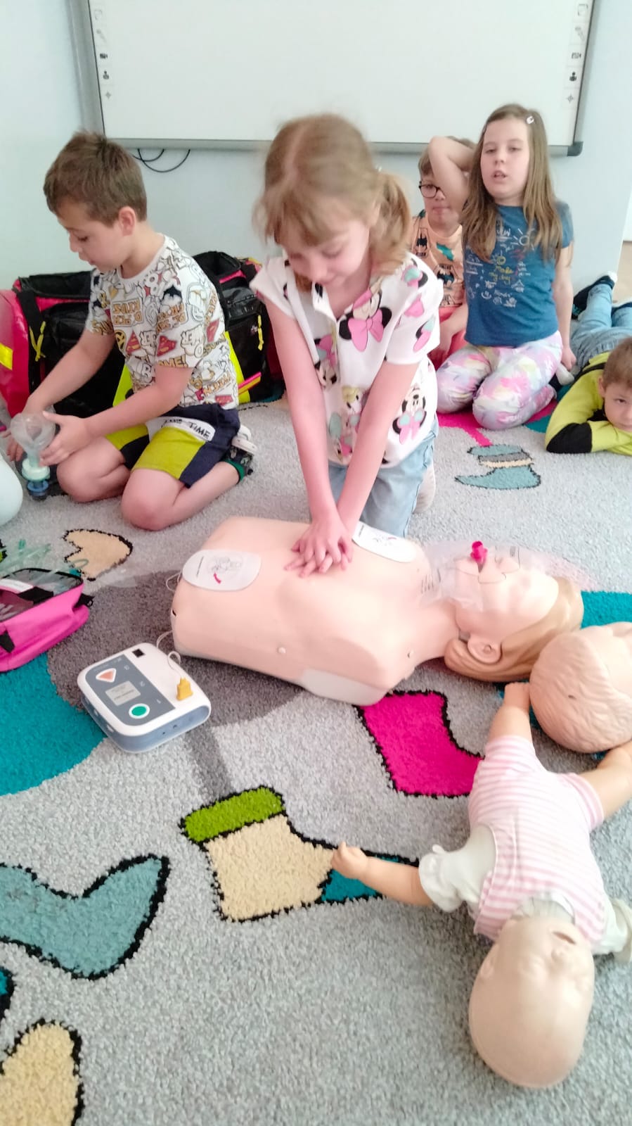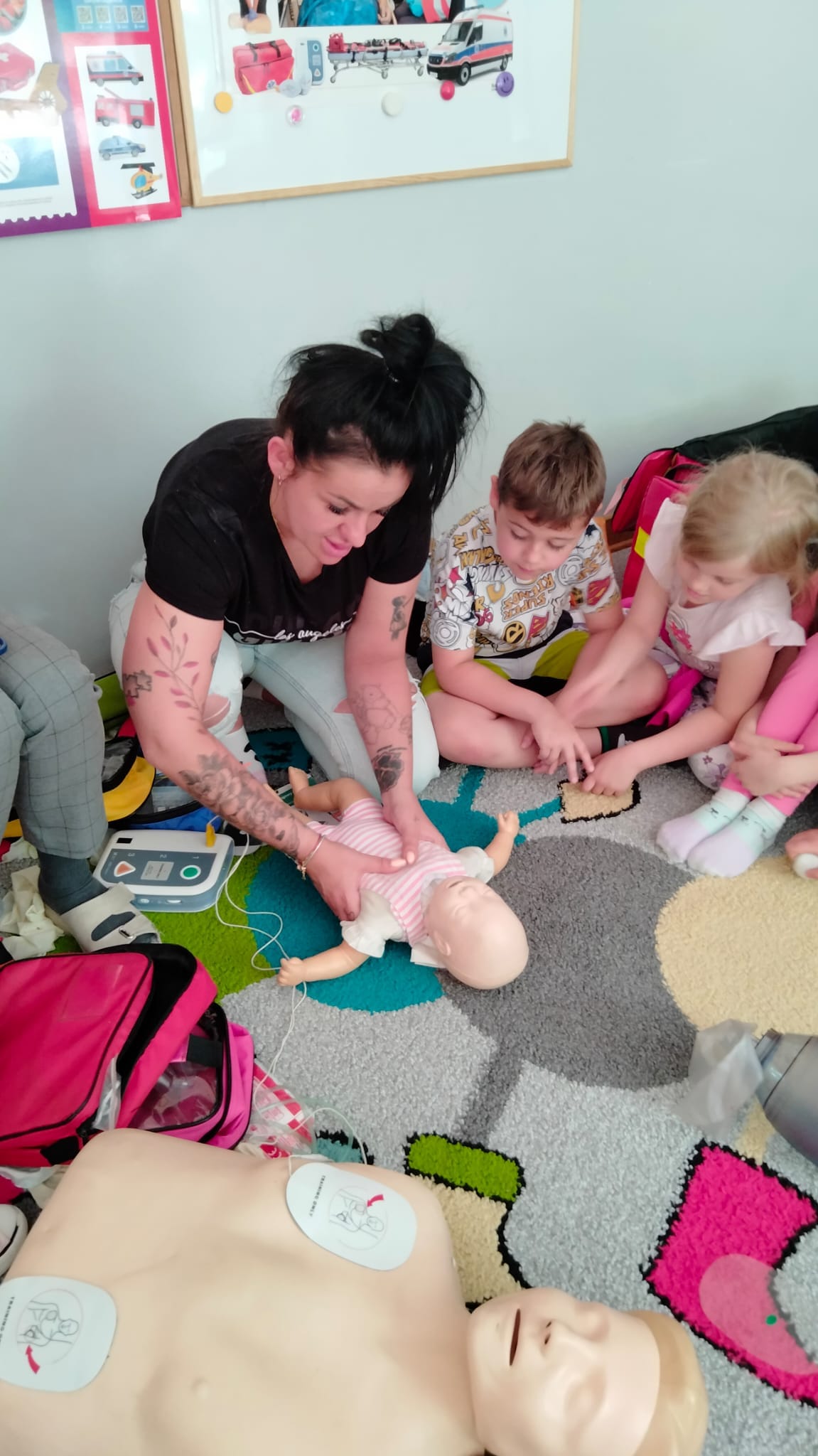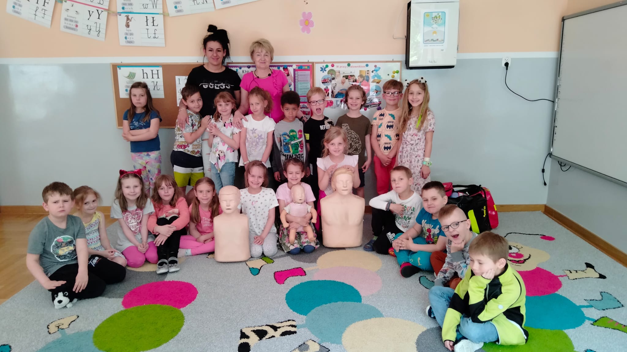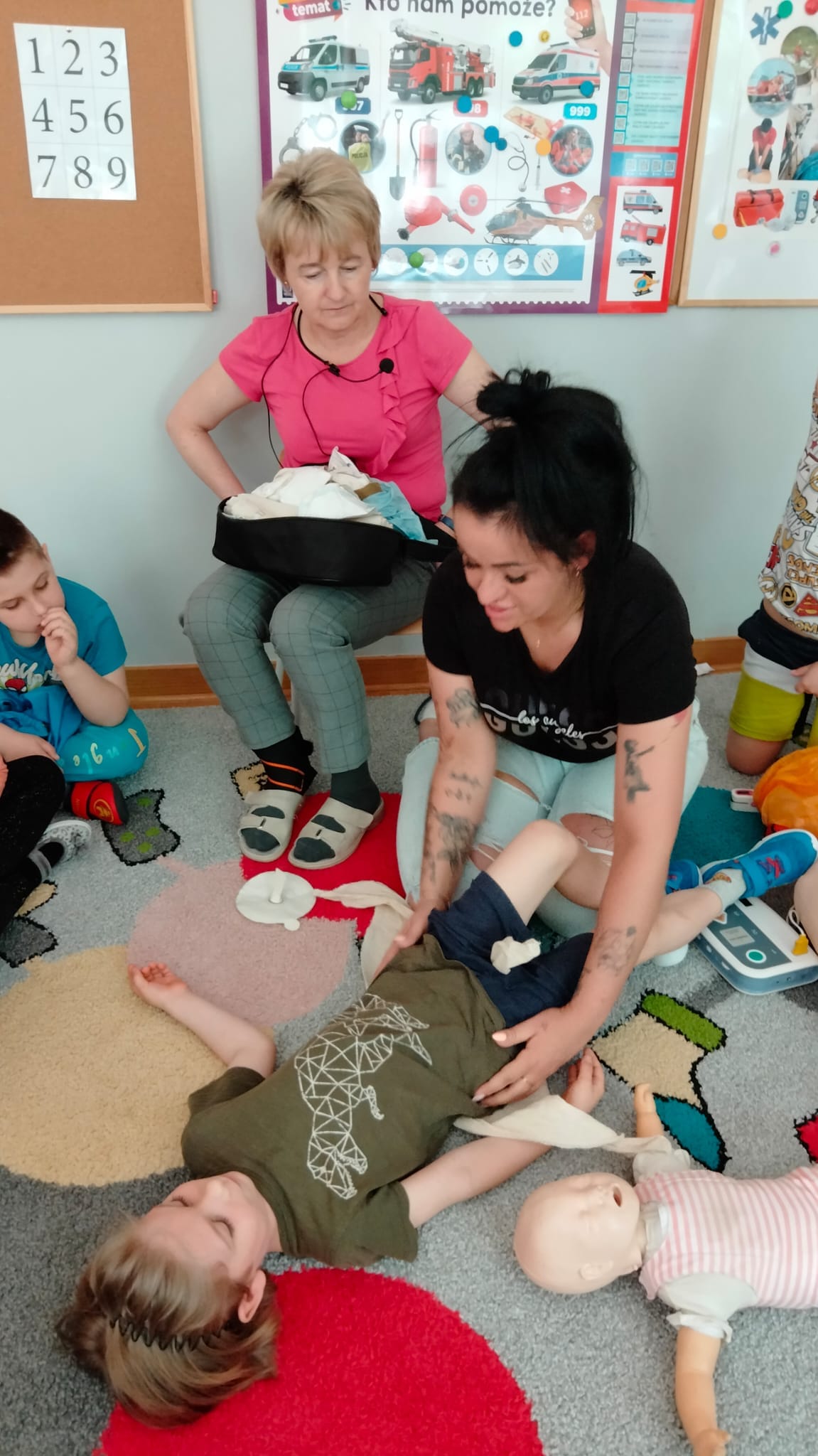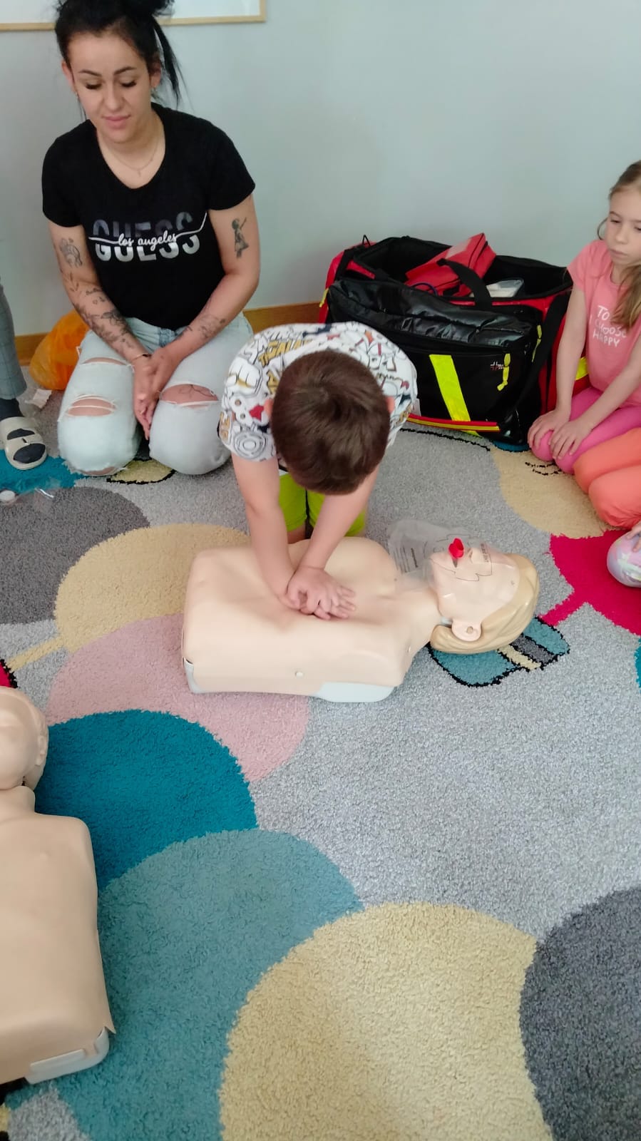 gościły ostatnio Mamę Michałka, która zapoznała ich z pracą ratownika medycznego. Dzieci zobaczyły jak wygląda resuscytacja krążeniowo oddechowa,obejrzały zawartość apteczki, defibrylator i inne sprzęty ratownika, które są na wyposażeniu karetki pogotowia. Dzięki przyniesionym fantomom dziecka i dorosłego dzieci próbowały „reanimować ” nieprzytomnego człowieka oraz wysłuchiwały bicie serca przez stetoskop. Przedszkolaki utrwaliły numery alarmowe i dowiedziały się jak należy się zachować w razie wypadku czy niebezpiecznej sytuacji