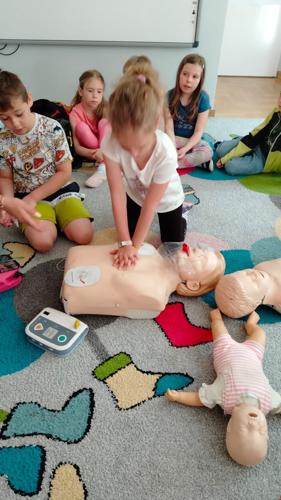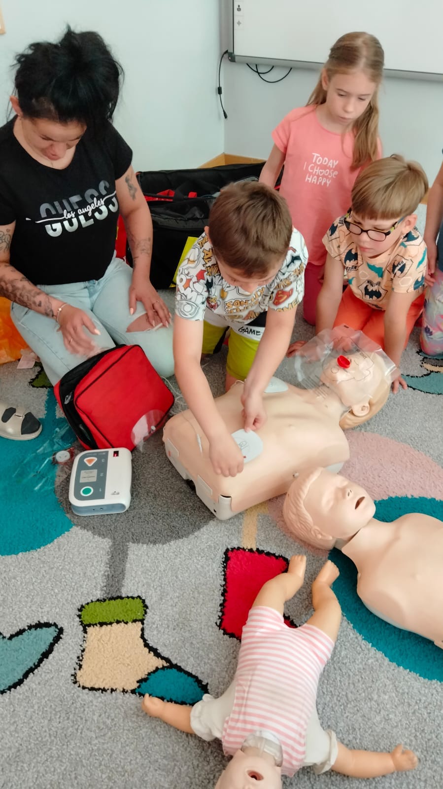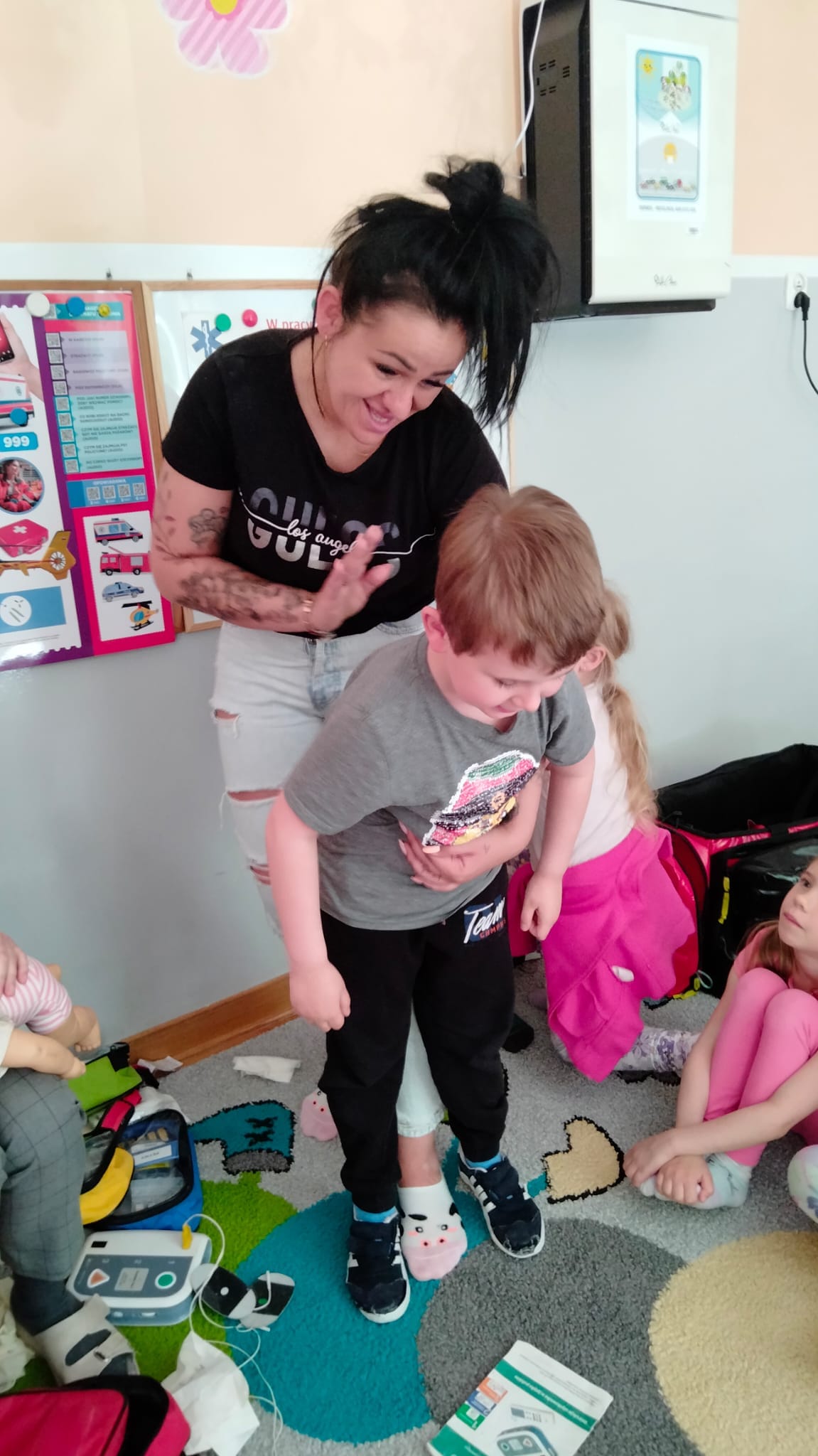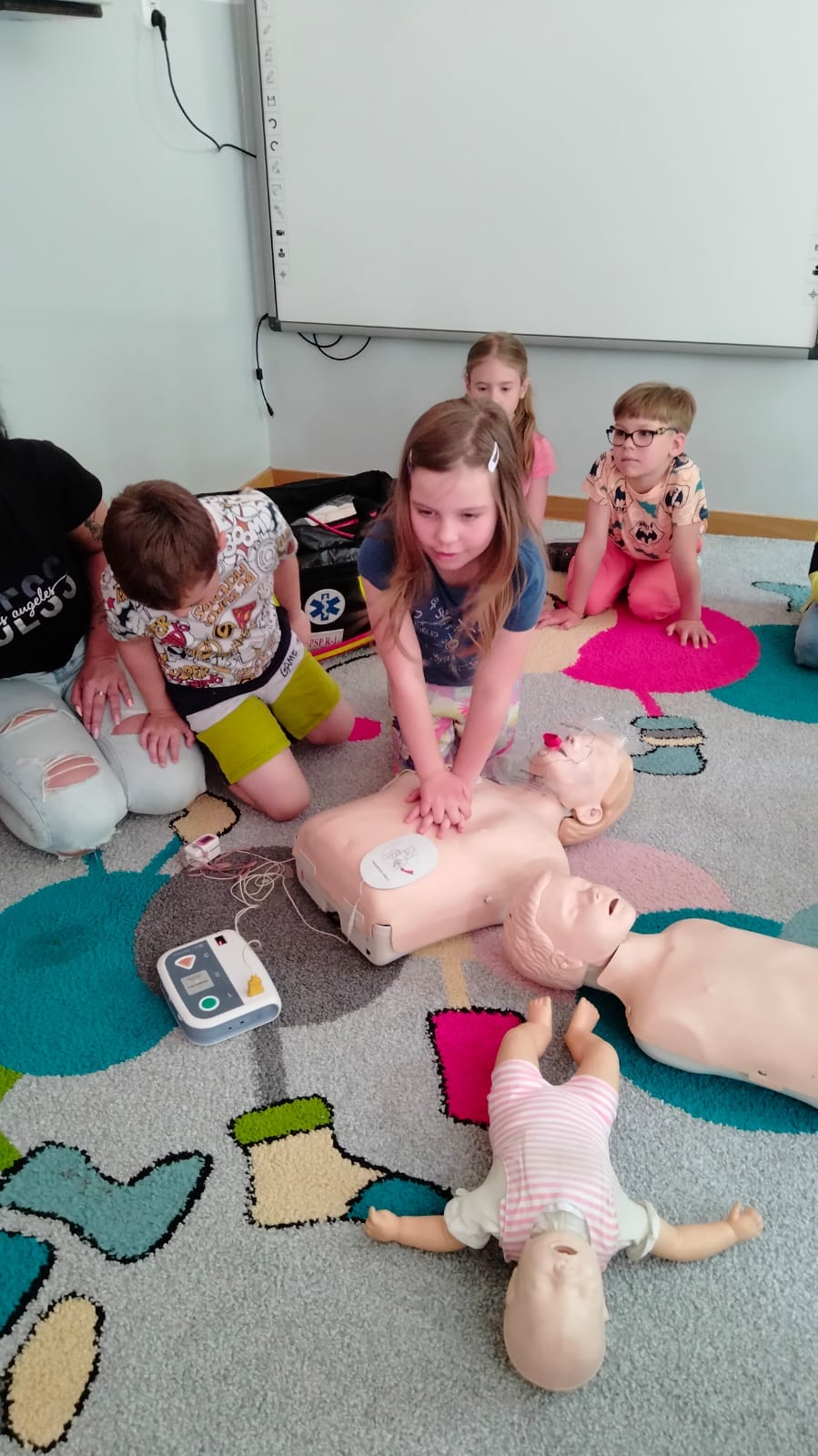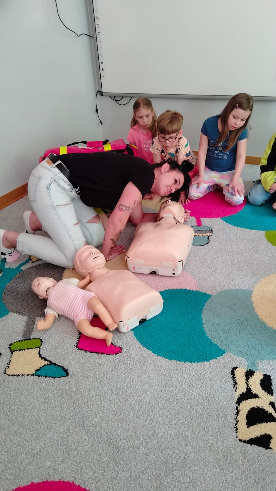 gościły ostatnio Mamę Michałka, która zapoznała ich z pracą ratownika medycznego. Dzieci zobaczyły jak wygląda resuscytacja krążeniowo oddechowa,obejrzały zawartość apteczki, defibrylator i inne sprzęty ratownika, które są na wyposażeniu karetki pogotowia. Dzięki przyniesionym fantomom dziecka i dorosłego dzieci próbowały „reanimować ” nieprzytomnego człowieka oraz wysłuchiwały bicie serca przez stetoskop. Przedszkolaki utrwaliły numery alarmowe i dowiedziały się jak należy się zachować w razie wypadku czy niebezpiecznej sytuacji