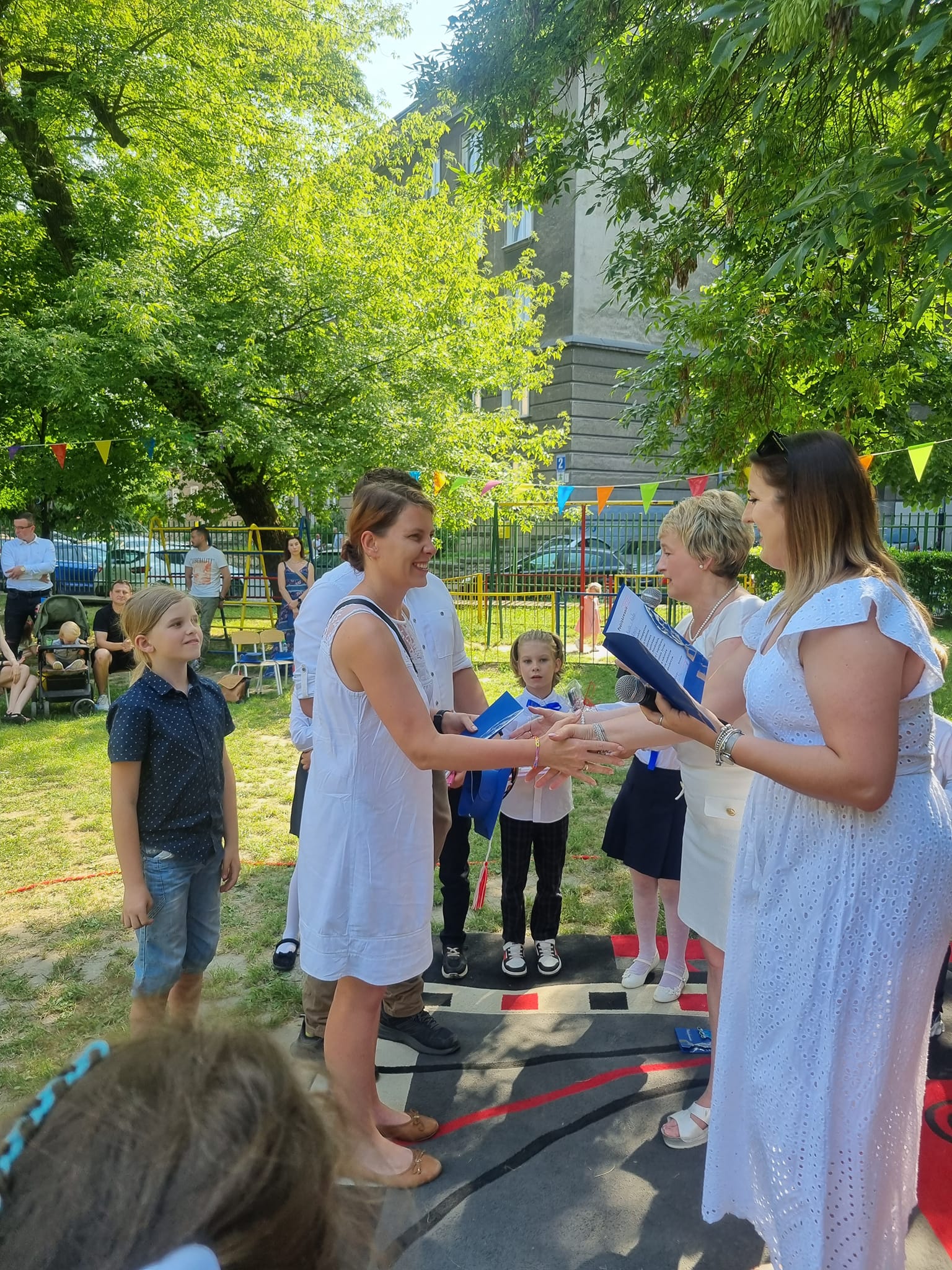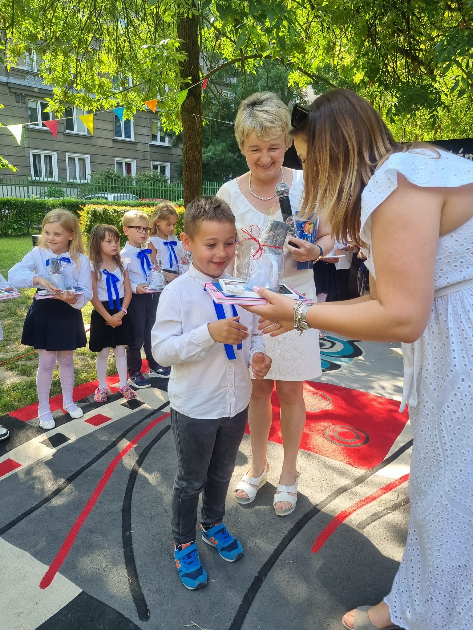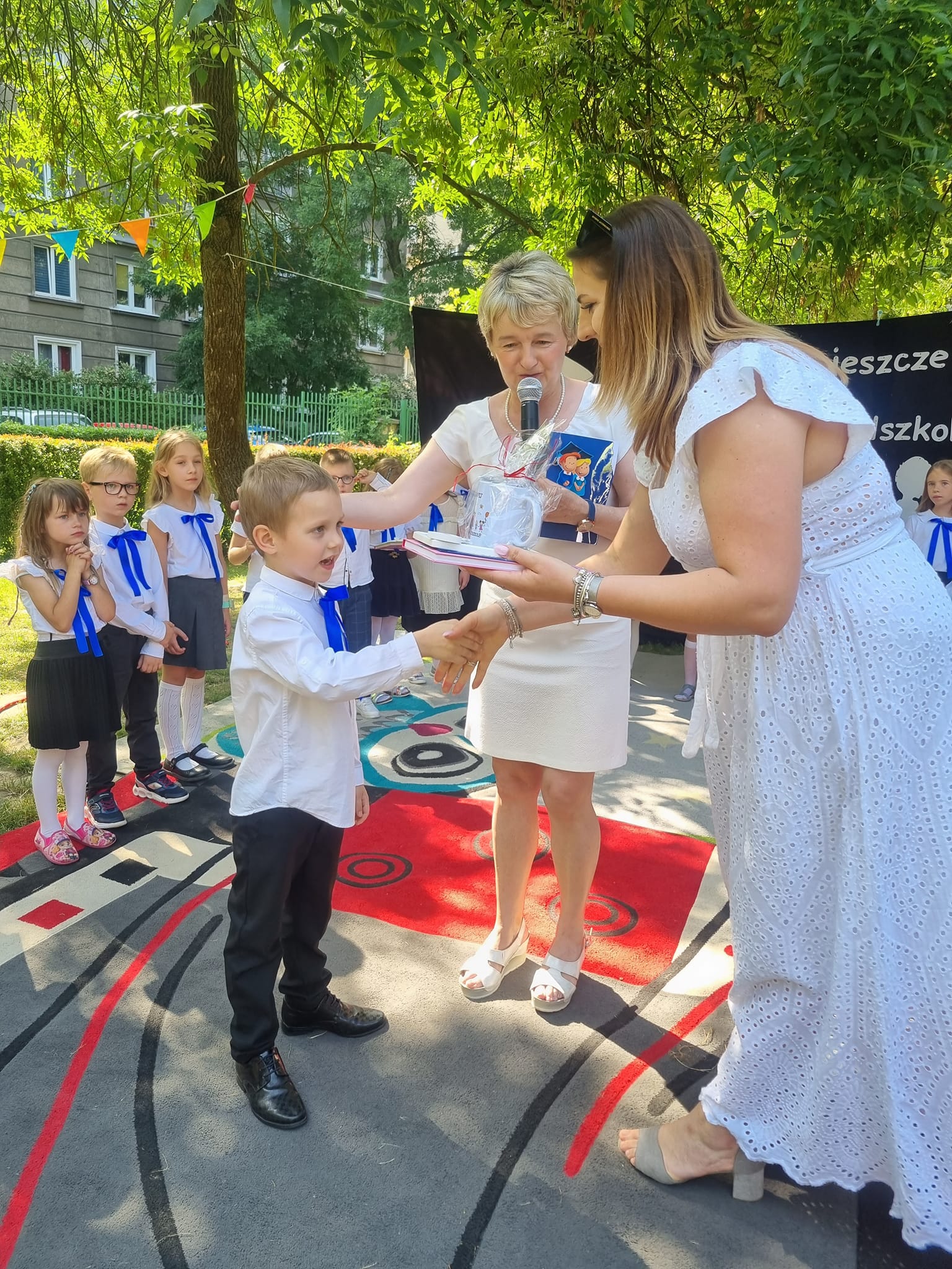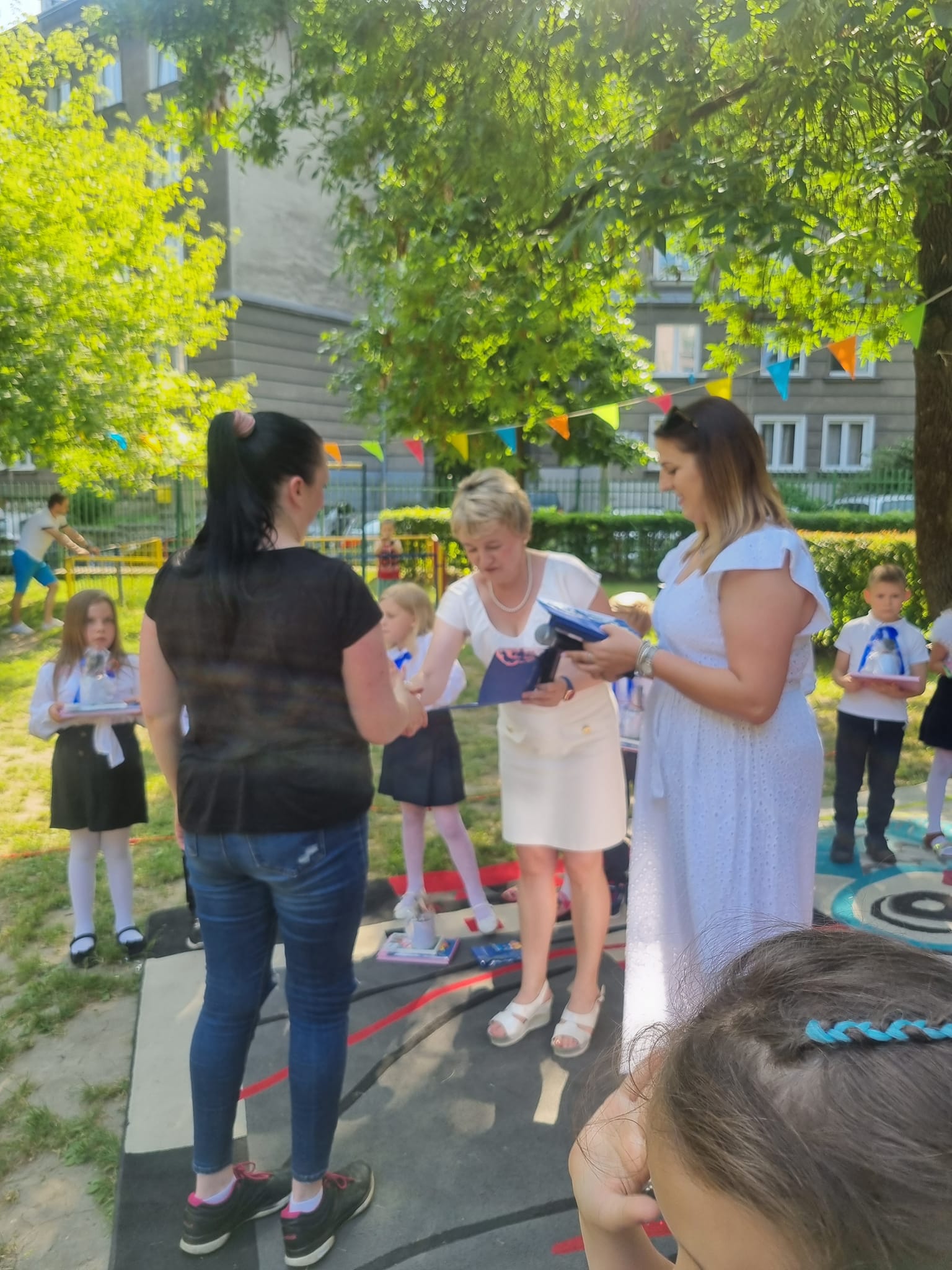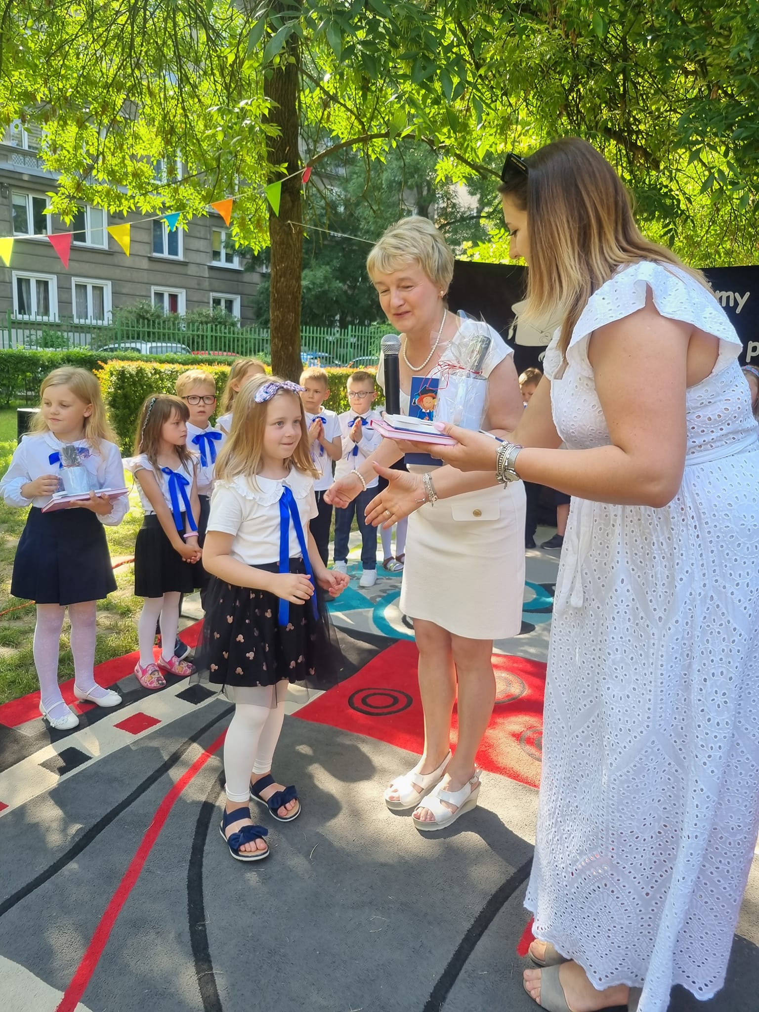 Po występie dzieci otrzymały oprócz biretów piękne dyplomy, książki, oryginalne kubki ze swoimi imionami i zestawy długopisów z ołówkami, a rodzice, którzy aktywnie angażowali się w życie przedszkola -podziękowania . Pani Kamila pożegnała uroczyście wszystkie dzieci i rodziców życząc dzieciom w imieniu Pani Dyrektor, nauczycieli i pracowników przedszkola dużo sukcesów w szkole , spełnienia marzeń, realizowania swoich pasji i zamierzeń. Rodzice ze swej strony również podziękowali Pani Dyrektor, Nauczycielkom oraz Pracownikom przedszkola za wspólnie spędzone lata.