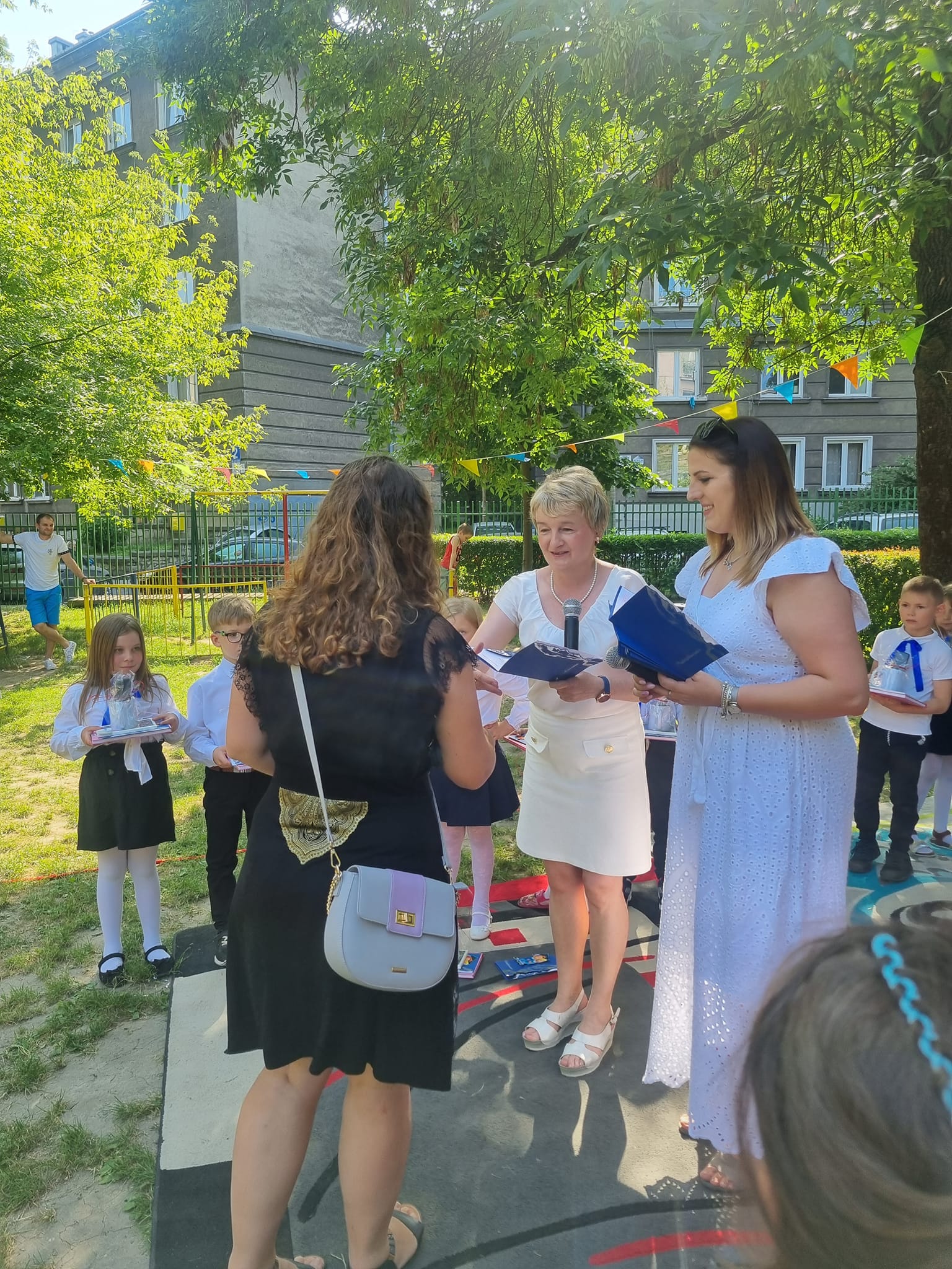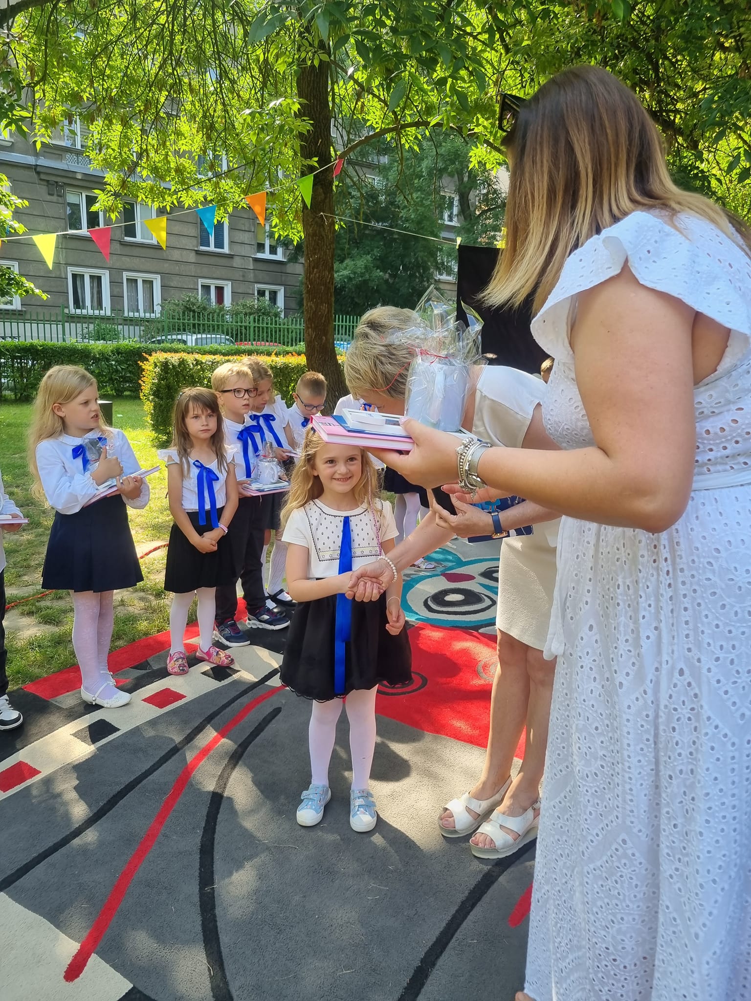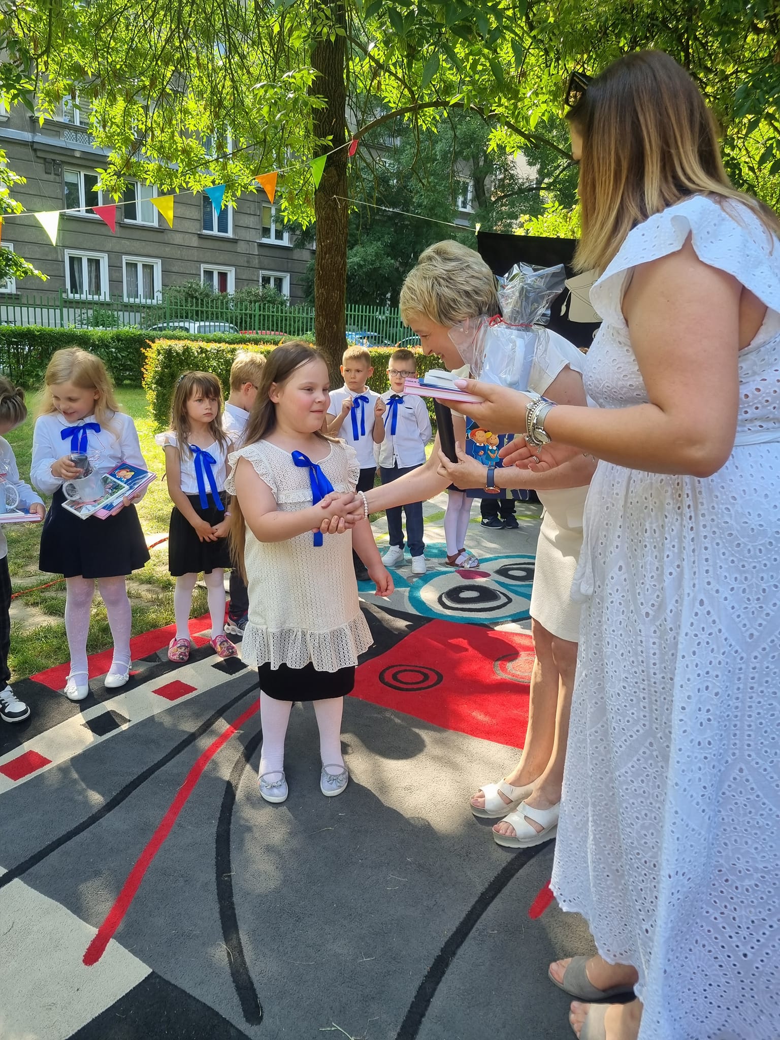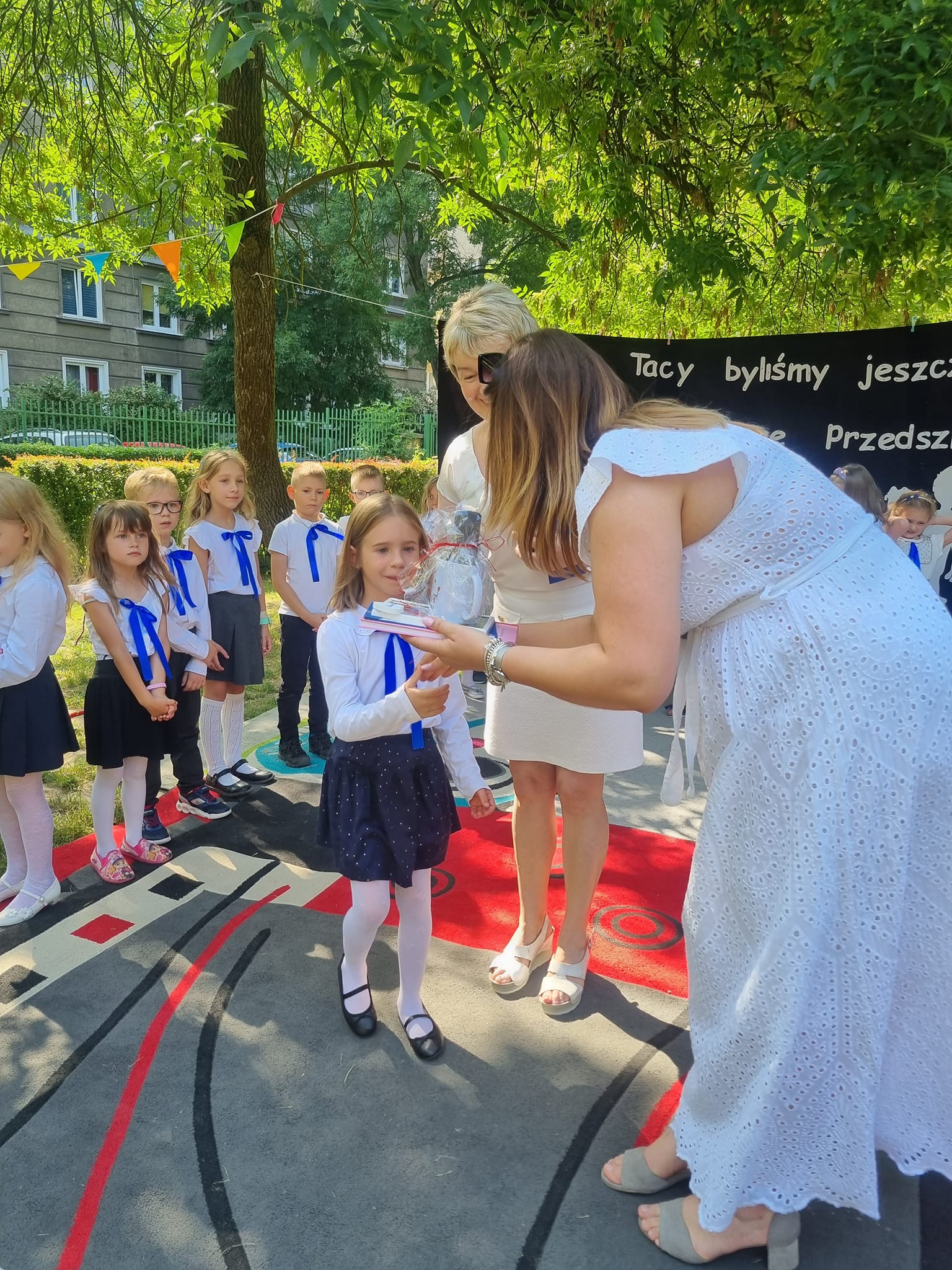 Po występie dzieci otrzymały oprócz biretów piękne dyplomy, książki, oryginalne kubki ze swoimi imionami i zestawy długopisów z ołówkami, a rodzice, którzy aktywnie angażowali się w życie przedszkola -podziękowania . Pani Kamila pożegnała uroczyście wszystkie dzieci i rodziców życząc dzieciom w imieniu Pani Dyrektor, nauczycieli i pracowników przedszkola dużo sukcesów w szkole , spełnienia marzeń, realizowania swoich pasji i zamierzeń. Rodzice ze swej strony również podziękowali Pani Dyrektor, Nauczycielkom oraz Pracownikom przedszkola za wspólnie spędzone lata.