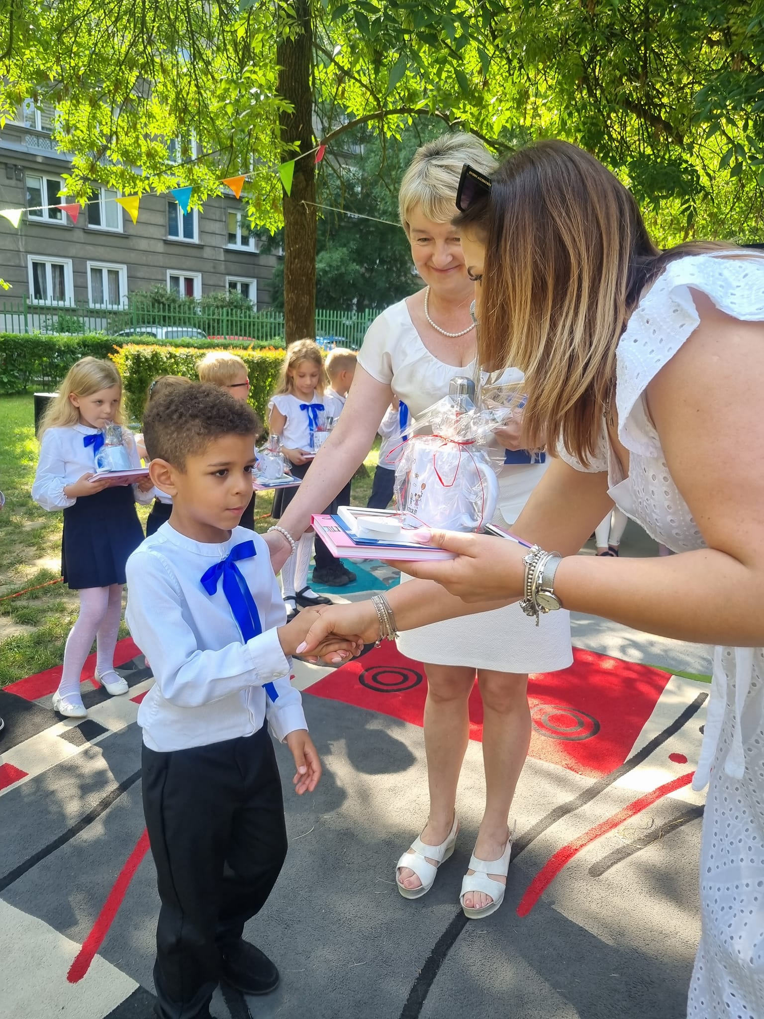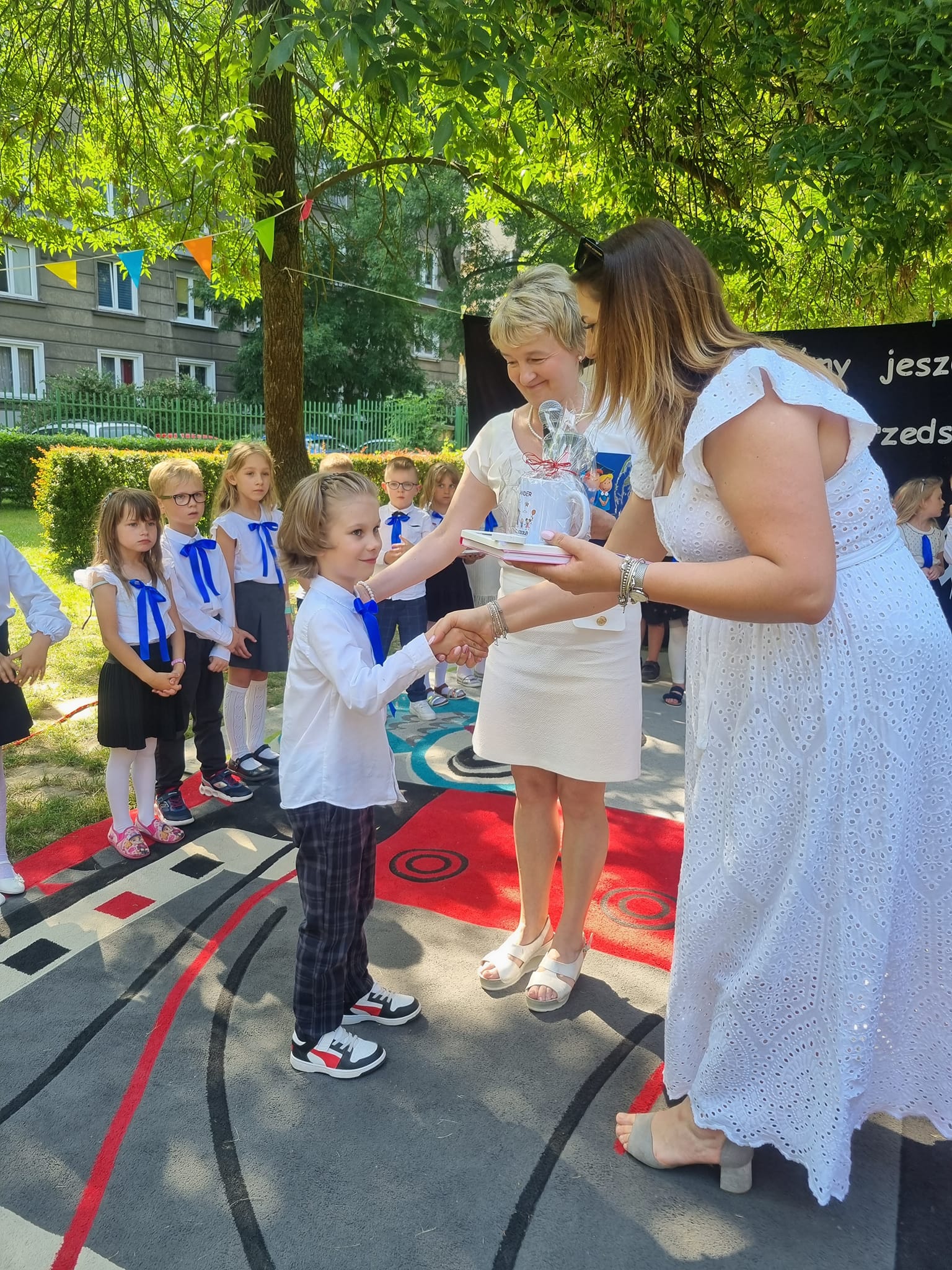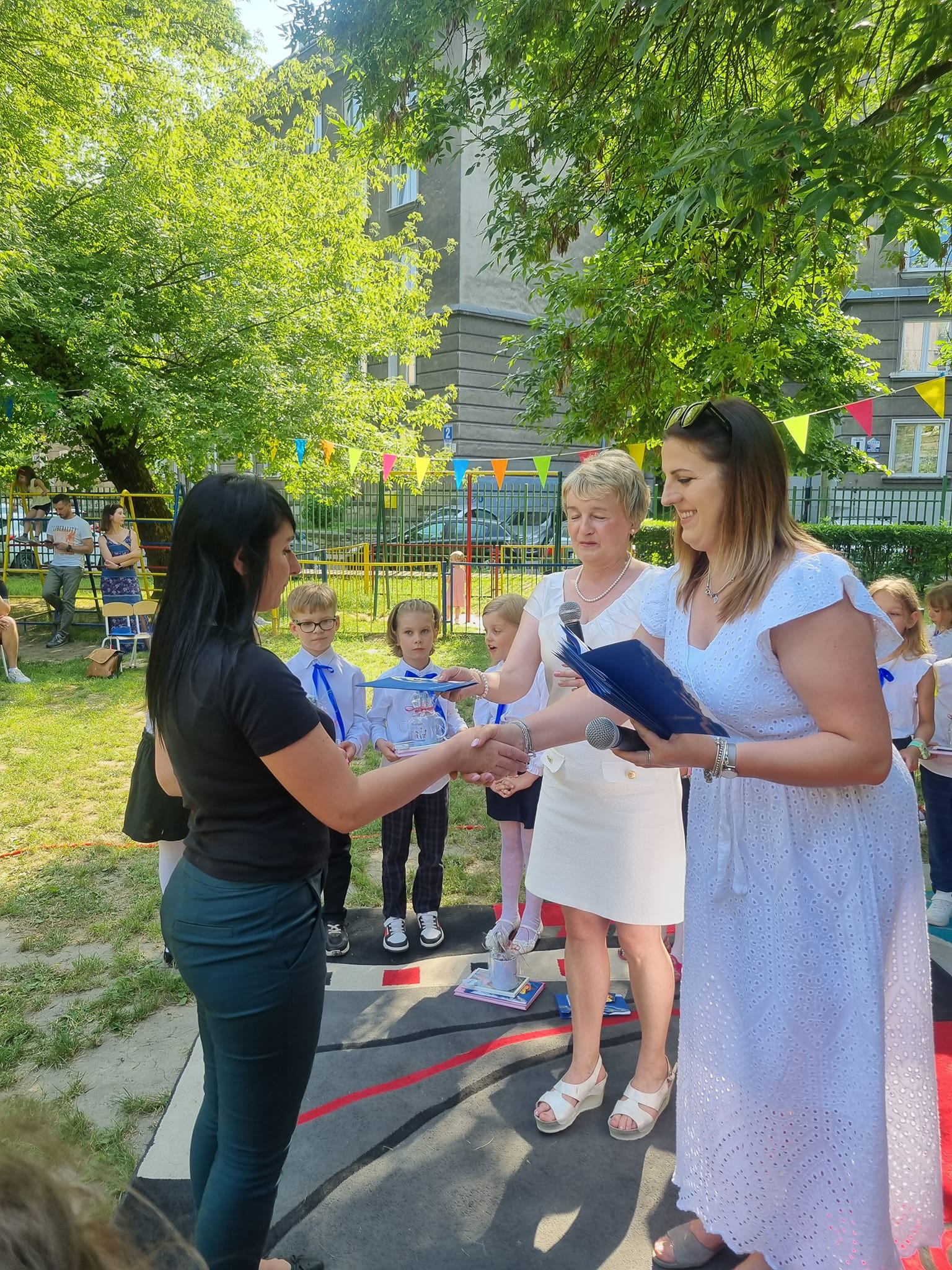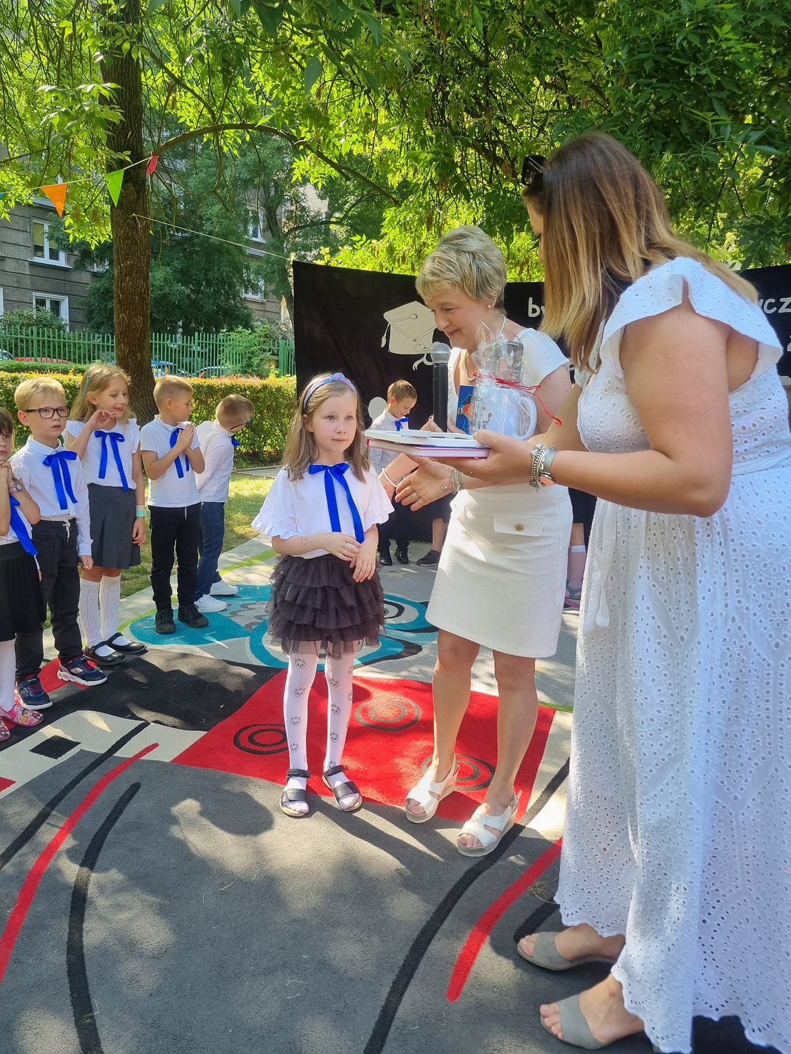 Po występie dzieci otrzymały oprócz biretów piękne dyplomy, książki, oryginalne kubki ze swoimi imionami i zestawy długopisów z ołówkami, a rodzice, którzy aktywnie angażowali się w życie przedszkola -podziękowania . Pani Kamila pożegnała uroczyście wszystkie dzieci i rodziców życząc dzieciom w imieniu Pani Dyrektor, nauczycieli i pracowników przedszkola dużo sukcesów w szkole , spełnienia marzeń, realizowania swoich pasji i zamierzeń. Rodzice ze swej strony również podziękowali Pani Dyrektor, Nauczycielkom oraz Pracownikom przedszkola za wspólnie spędzone lata.