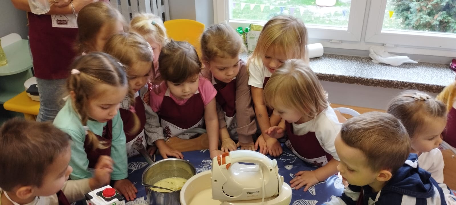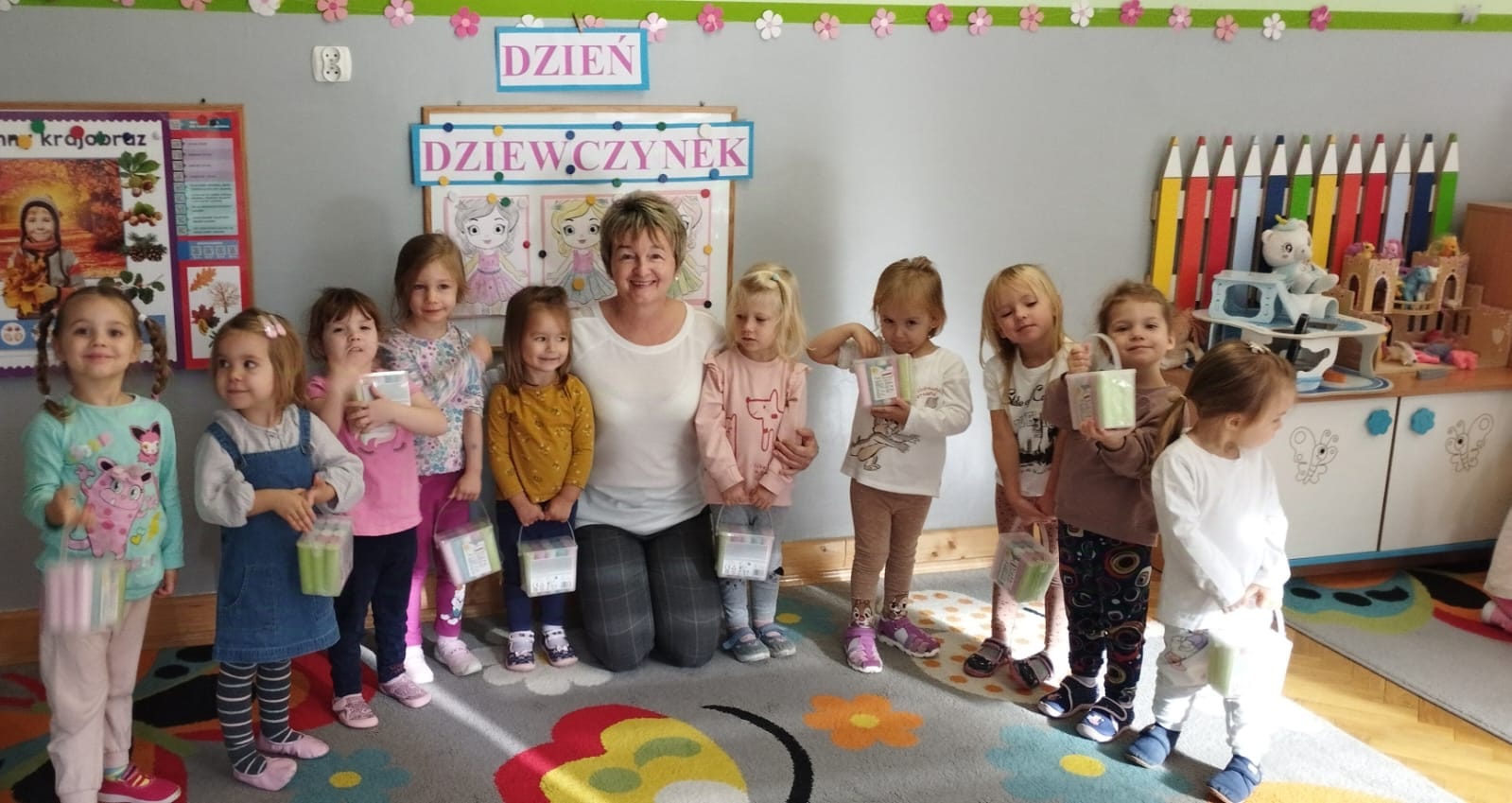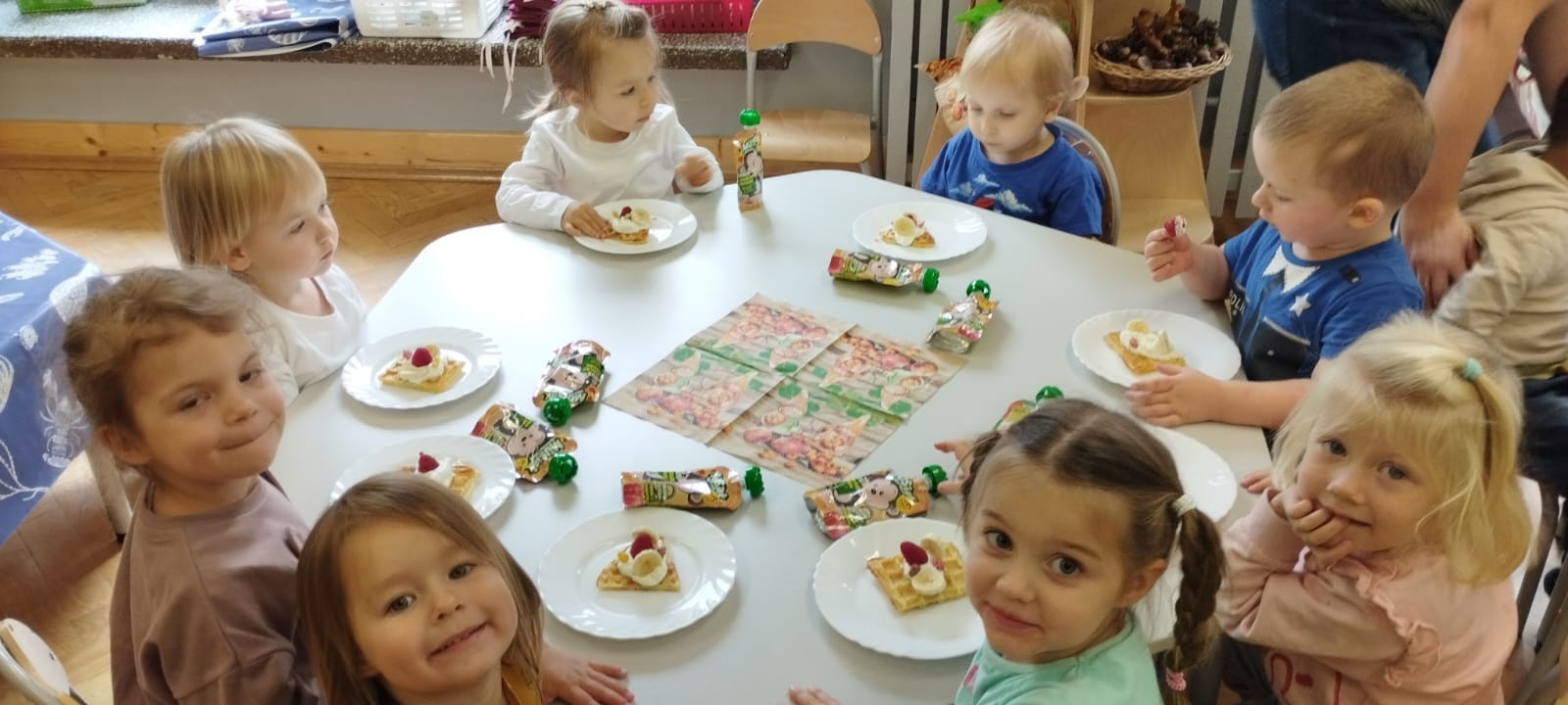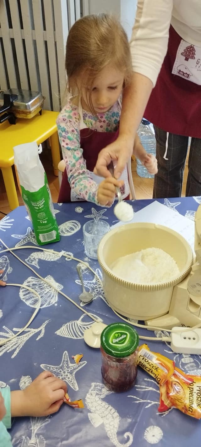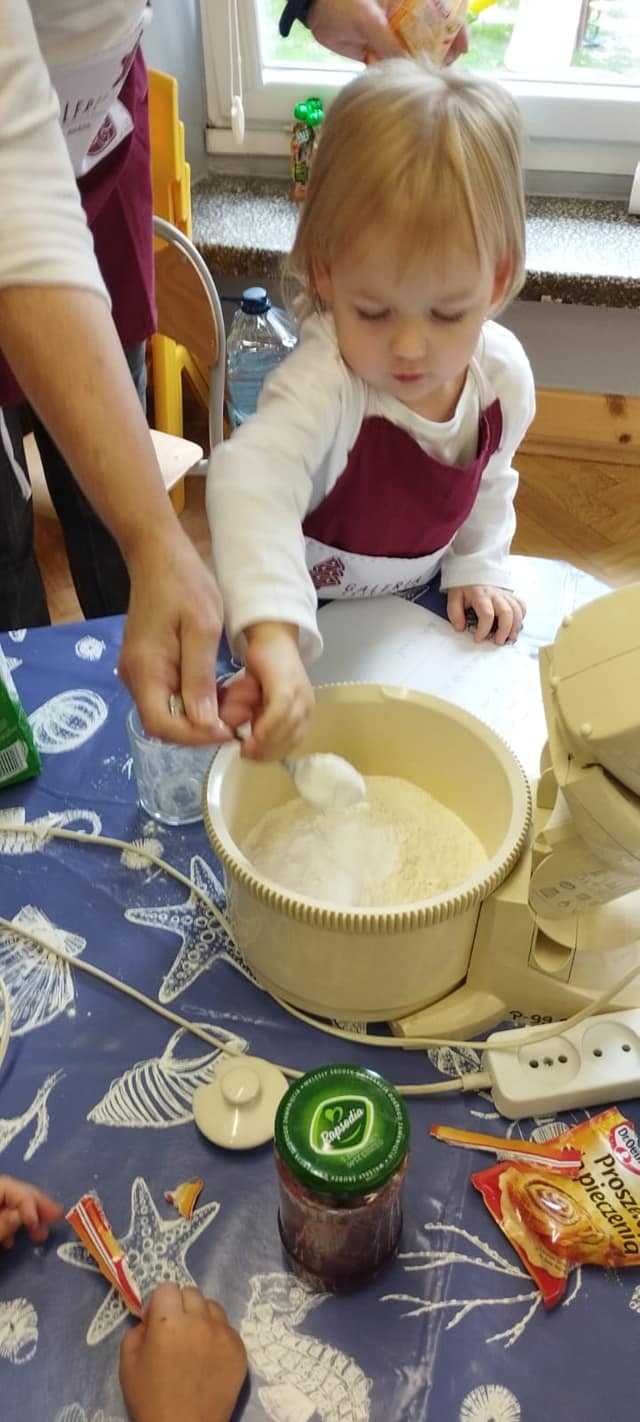 Podobnie jak „Dzień Chłopaka” we wrześniu świętowaliśmy w październiku „Dzień Dziewczynek”, a ponieważ jest ich w naszej grupie więcej niż chłopców to i obchody były huczniejsze. Dziewczynki jak to kobiety😄 wzięły się do roboty i po otrzymaniu prezentów zakasały rękawy🤣, założyły fartuszki i upiekły sobie gofry.🧇Nie sprawdziło się powiedzenie, że „gdzie kucharek sześć tam nie ma co jeść”.U nas było i bawiliśmy się cudownie.