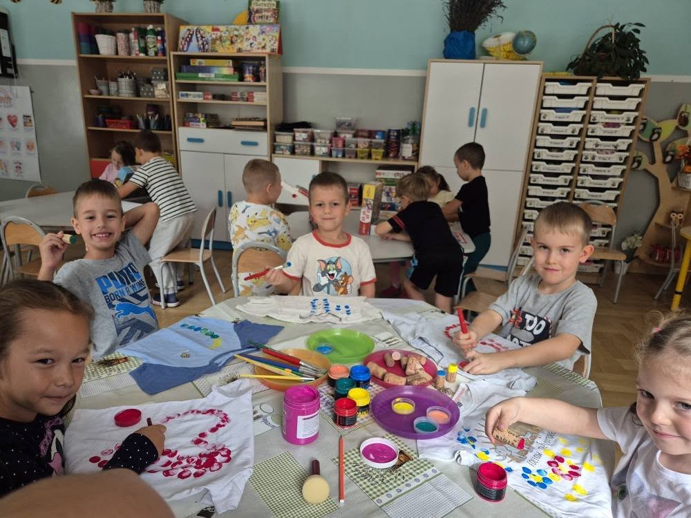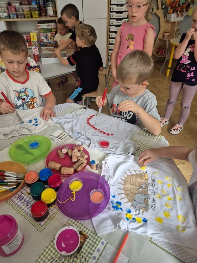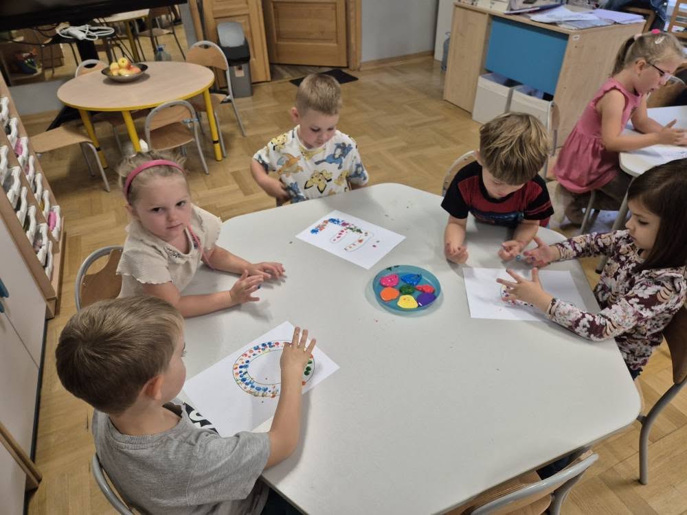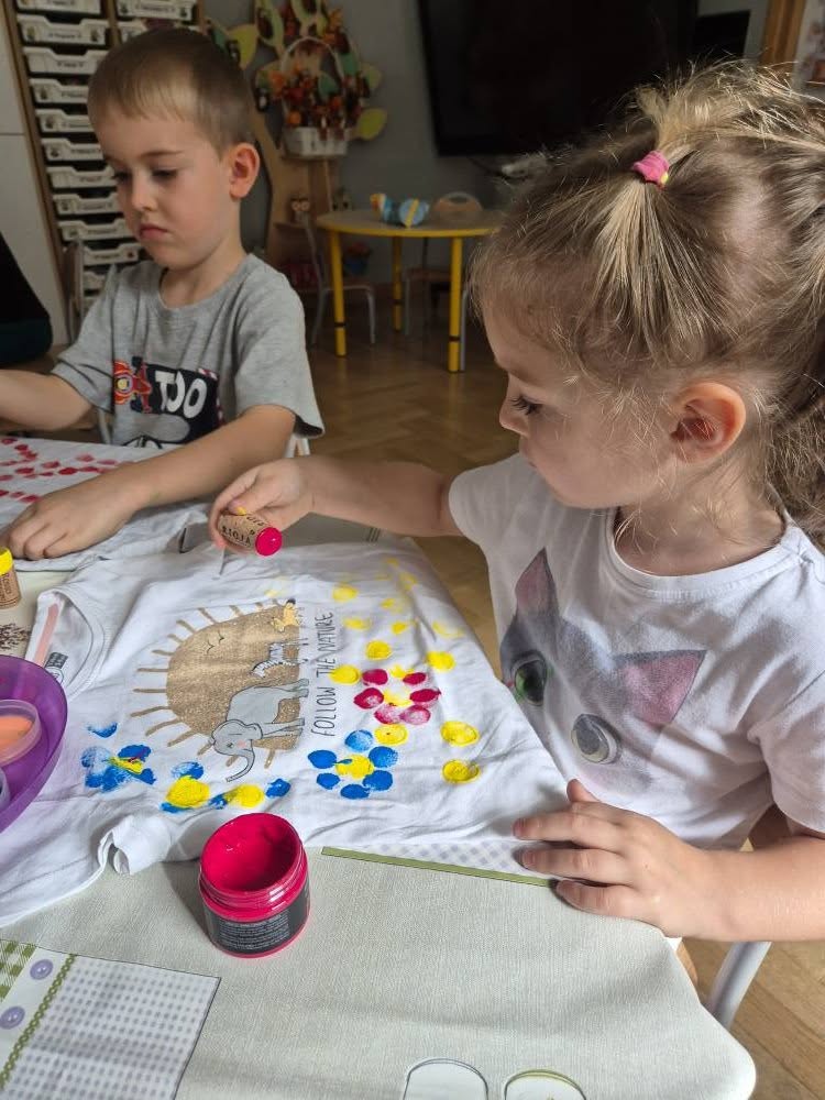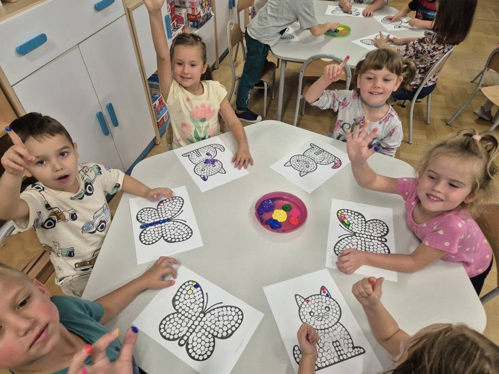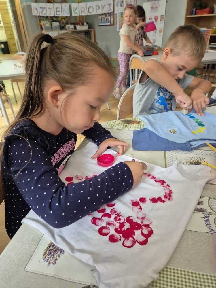 Dziś świętowaliśmy Międzynarodowy Dzień Kropki – wyjątkowy czas pełen kreatywności i dobrej zabawy. Najpierw poznaliśmy opowieść o magicznej kropce, która zainspirowała nas do rozmów o jej znaczeniu. Potem tworzyliśmy barwne prace malowane farbami, składające się wyłącznie z kropek, a przy dźwiękach piosenki „Podajemy kropki” bawiliśmy się i tańczyliśmy. Na zakończenie każdy miał okazję ozdobić koszulkę według własnego pomysłu, dając upust swojej wyobraźni.