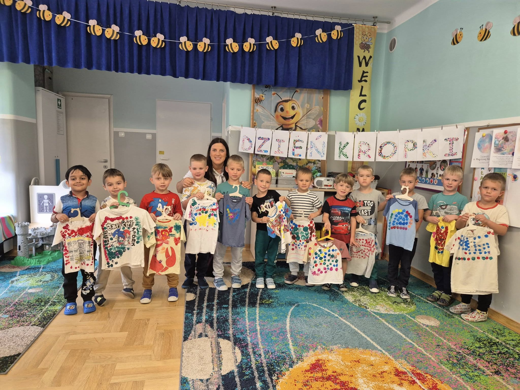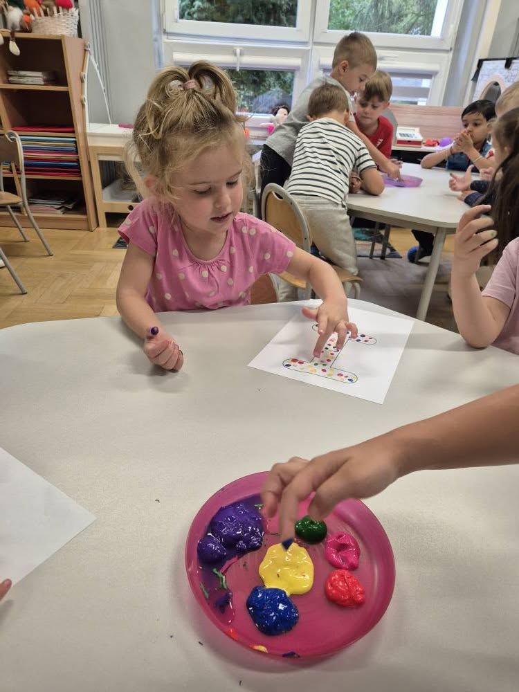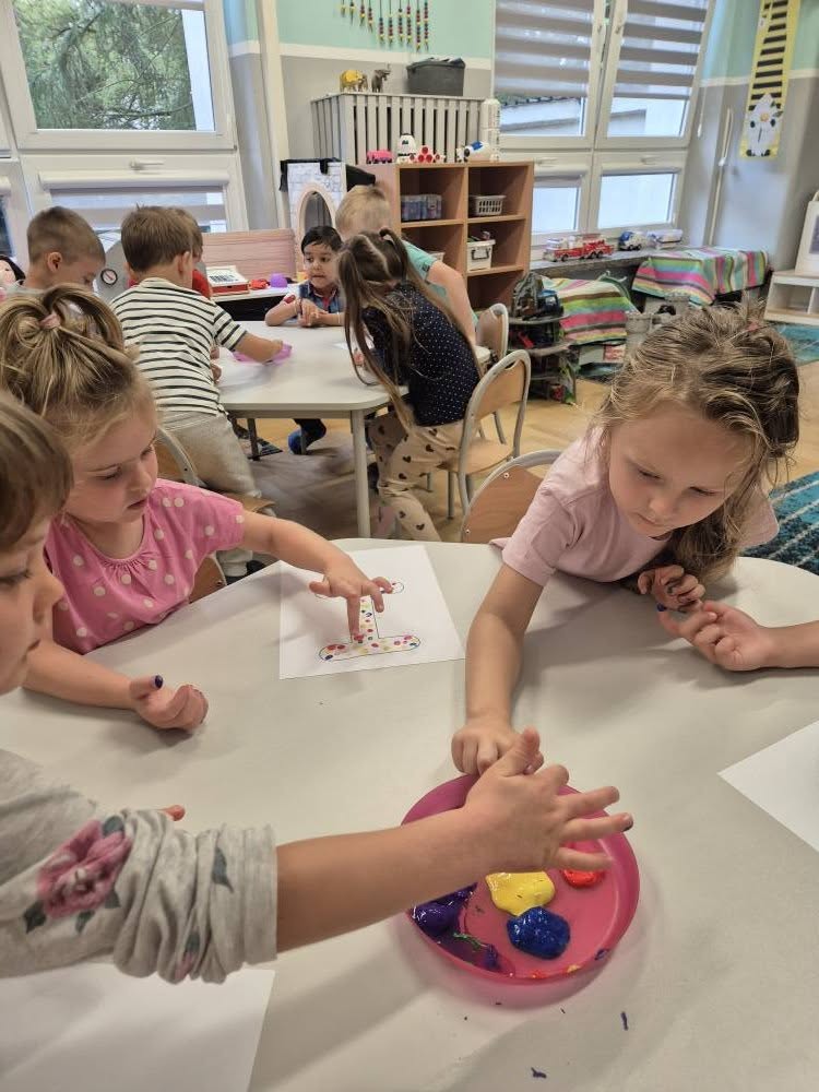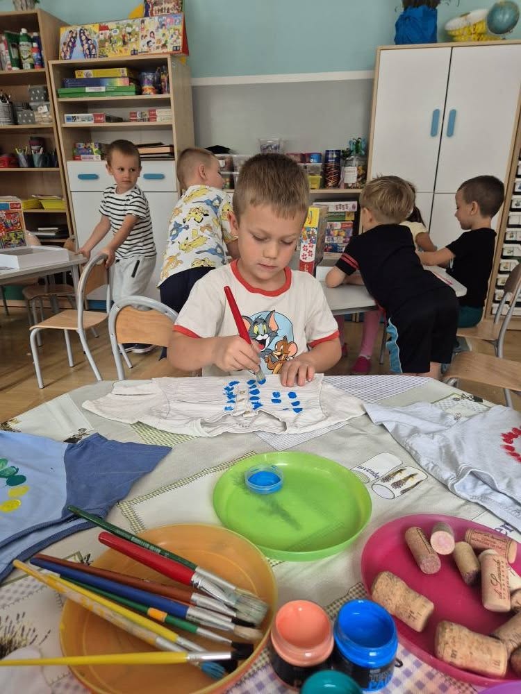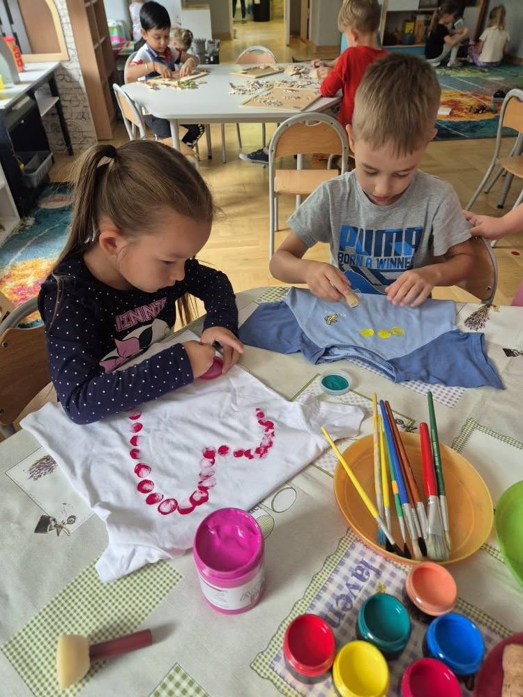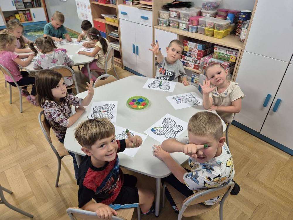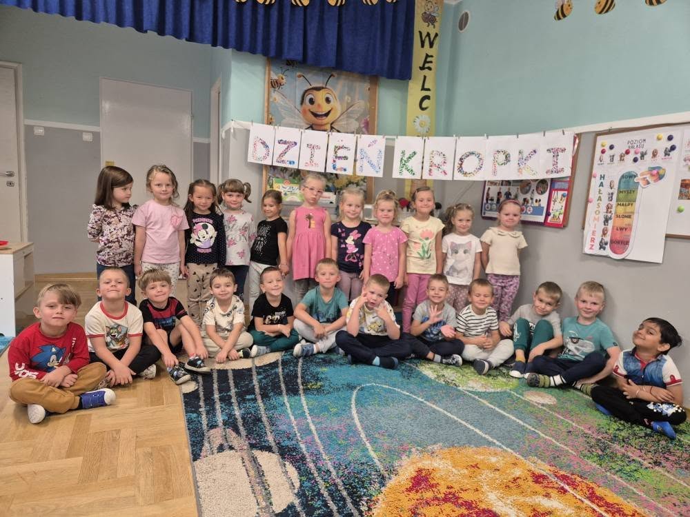 Dziś świętowaliśmy Międzynarodowy Dzień Kropki – wyjątkowy czas pełen kreatywności i dobrej zabawy. Najpierw poznaliśmy opowieść o magicznej kropce, która zainspirowała nas do rozmów o jej znaczeniu. Potem tworzyliśmy barwne prace malowane farbami, składające się wyłącznie z kropek, a przy dźwiękach piosenki „Podajemy kropki” bawiliśmy się i tańczyliśmy. Na zakończenie każdy miał okazję ozdobić koszulkę według własnego pomysłu, dając upust swojej wyobraźni.