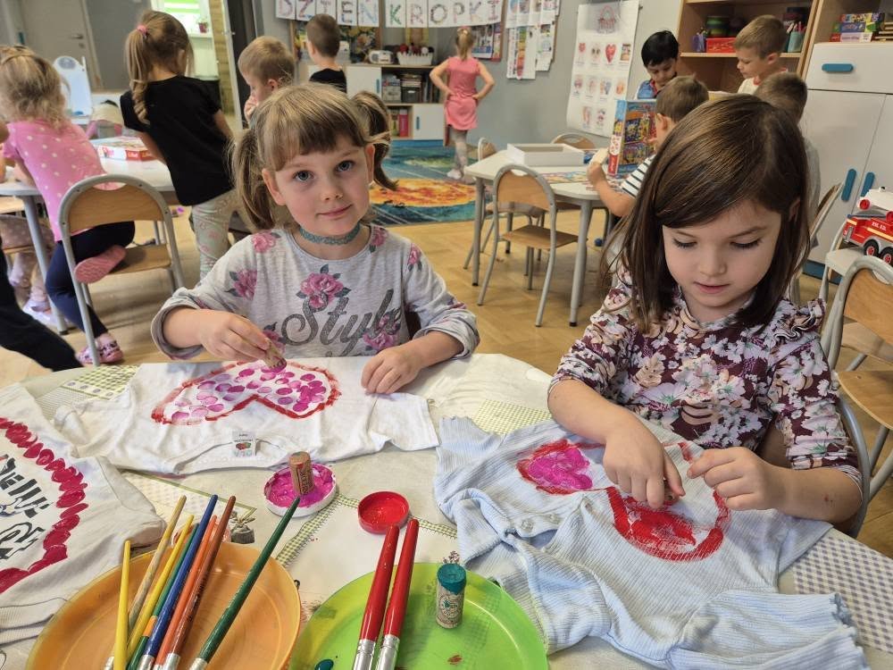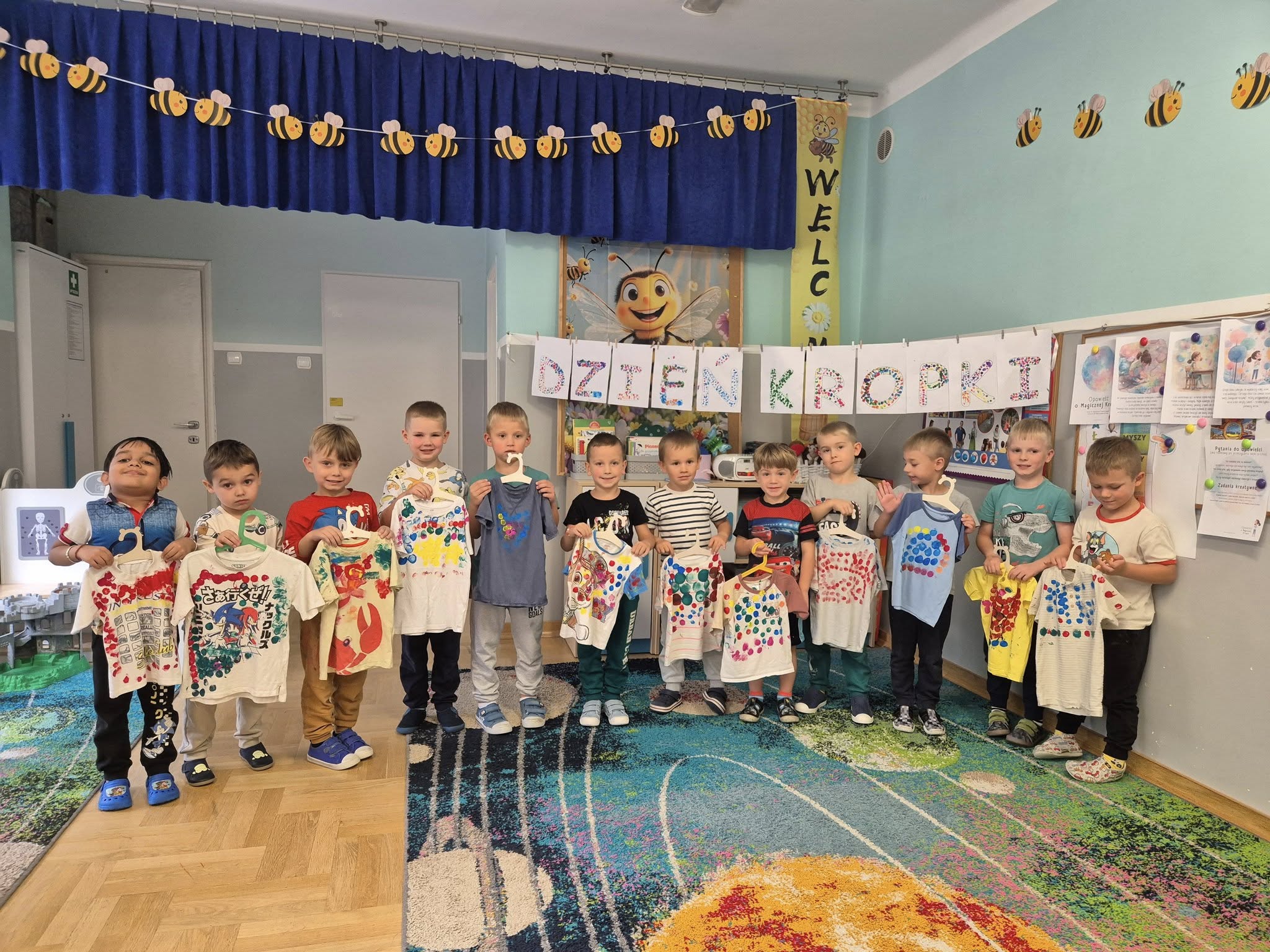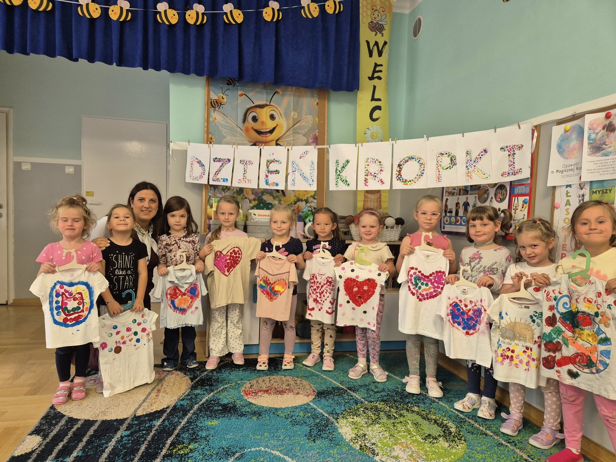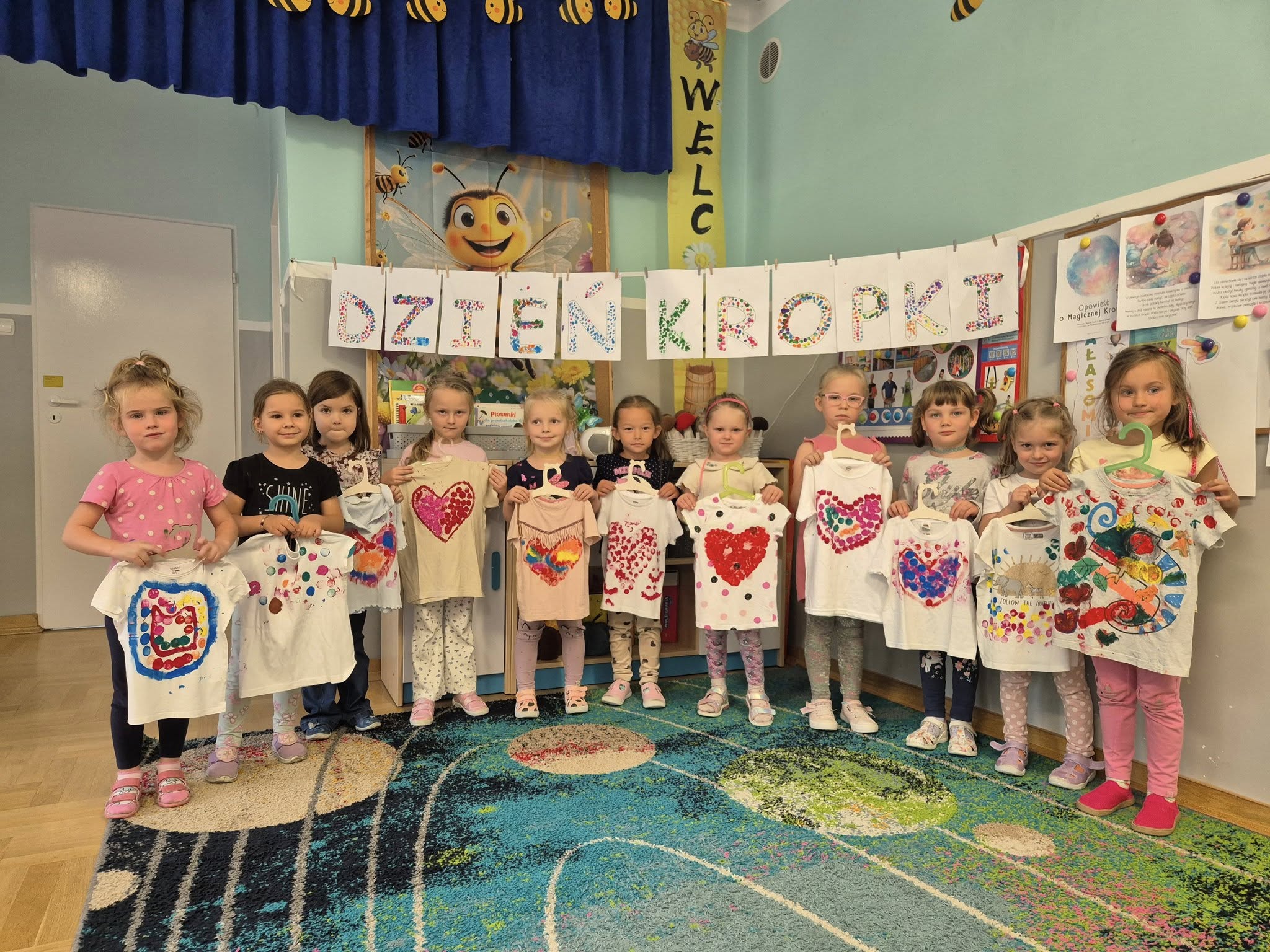 Dziś świętowaliśmy Międzynarodowy Dzień Kropki – wyjątkowy czas pełen kreatywności i dobrej zabawy. Najpierw poznaliśmy opowieść o magicznej kropce, która zainspirowała nas do rozmów o jej znaczeniu. Potem tworzyliśmy barwne prace malowane farbami, składające się wyłącznie z kropek, a przy dźwiękach piosenki „Podajemy kropki” bawiliśmy się i tańczyliśmy. Na zakończenie każdy miał okazję ozdobić koszulkę według własnego pomysłu, dając upust swojej wyobraźni.
