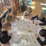 Najpierw odrysowaliśmy kształty, potem zgrzewaliśmy folię do laminowania, a dzieci wypełniały swoje dynie cekinami, koralikami i wodą zabarwioną na pomarańczowo.