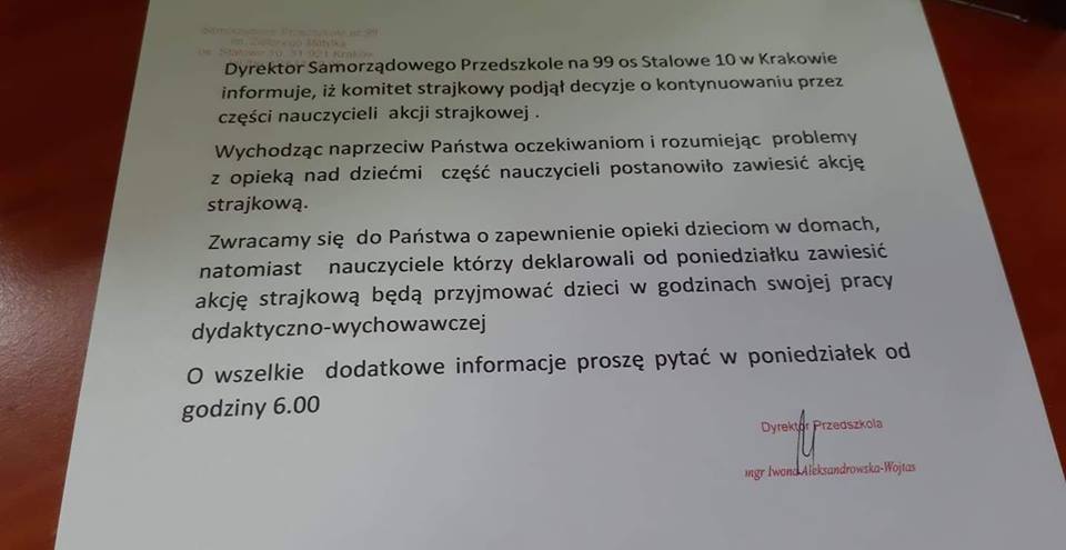 Dyrektor Samorządowego Przedszkola nr 99 w Krakowie informuje, iż komitet strajkowy podjął decyzje o kontynuowaniu przez część nauczycieli akcji strajkowej.